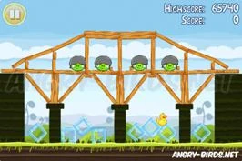 En primer lugar enviar al pájaro amarillo a través de la segunda tabla de madera (inclinada). Hacer esto de nuevo con otro pájaro y el lado izquierdo del puente se destruirá. Finalmente disparar al tercer pájaro amarillo hacia el eje central y el puente entero colapsará. El pájaro sobrante no utilizado le concederá al jugador un extra de 10.000 puntos.