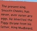 - El libro también revela que el verdadero nombre del Rey Cerdo es Smooth Cheeks, así como también se dice que es el hijo del Rey Mudbread, posteriormente en la película, se menciona que el Rey Mudbread (Barbalodo en español) era Leonard.