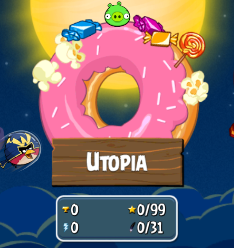O planeta de Utopia é um Donut gigante. Este é o primeiro episódio a receber mais de um design de planeta: um biscoito, um donut, uma torta de limão, um planeta gelatinoso e uma maçã caramelada. Esta é a primeira vez que o Porco Gordo aparece como inimigo (primeira aparição no nível 4–10) e como um chefe enorme (nível 4–30). Bubbles apareceu na última atualização de Utopia, lançada em 23 de julho de 2012. Ele aparece pela primeira vez no nível 4–11 do Utopia.