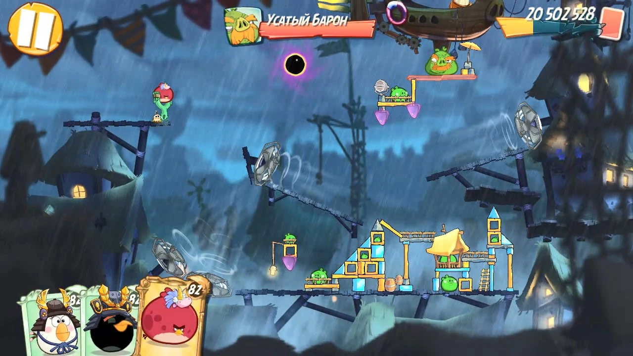 5 комнат, наиболее сложна третья из-за огромных размеров (впрочем, иногда возможен страйк Теренсом). Этот уровень повторяет 733-й, но дыра, в которую должен был упасть Усатый Барон, заделана, а в воздухе появилась ещё одна аномалия. Аккуратно снесите конструкции слева от Усача, не свалив его самого, а затем ударьте его Серебрянкой снизу и выбейте за пределы уровня. Впрочем, можно, хотя и невероятно сложно, истощить его здоровье: нацельтесь Теренсом через чёрную дыру прямо в глаз Усачу, и тот получит большой урон, если Теренс будет его давить и наверху, и вблизи первого, и вблизи второго вентилятора. Остаётся лишь добить его оставшимися сильными птицами.