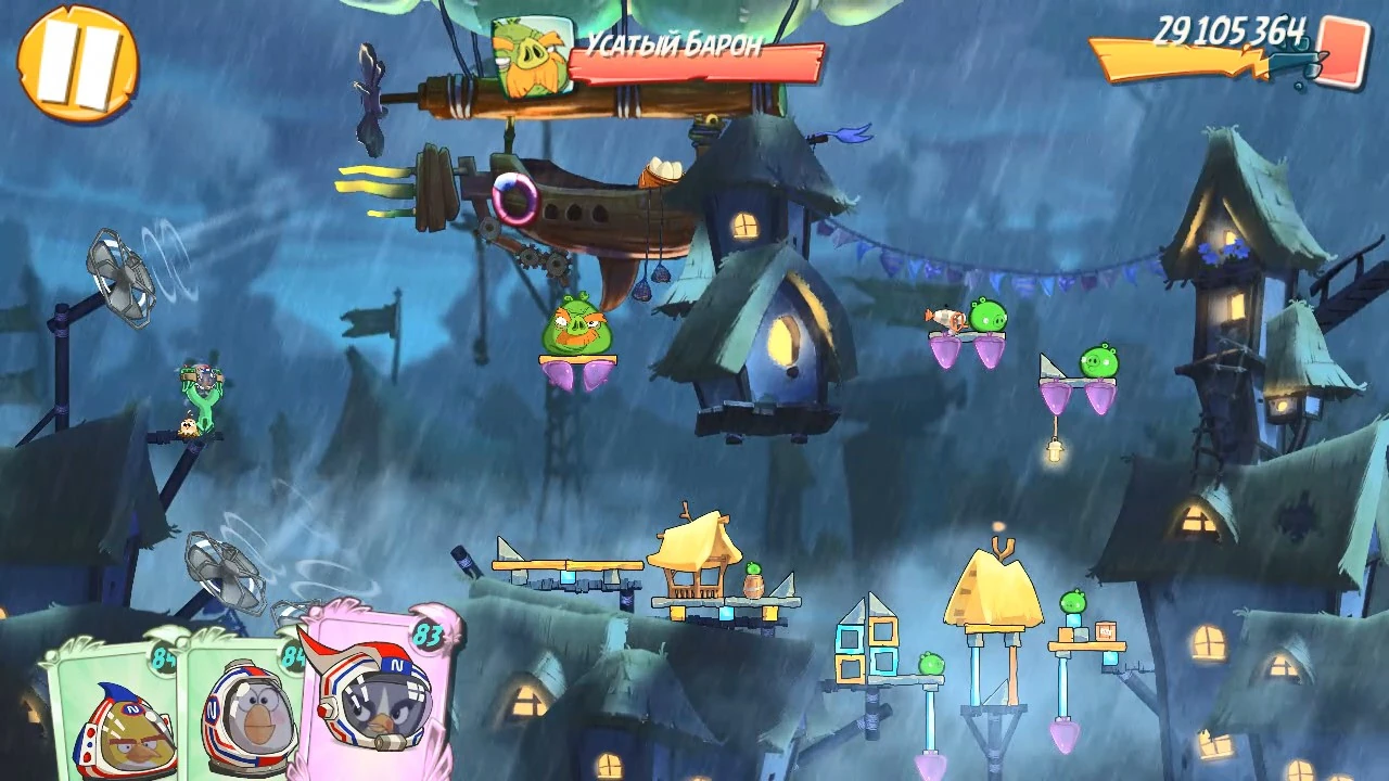7 сложных комнат, однако уровень проходим и без «режима жалости». В первой комнате воздушная конструкция два строения, второе правее и чуть ниже первого, вероятно, что придётся потратить 2-3 птиц. Во 2-й дальнее строение находится выше ближайшего, пробейте его Теренсом, чтобы его карту вернули. В 3-ей 3 здания, между которыми вентиляторы. Иногда страйк может сделать Бомб, брошенный в центральное здание. Возможно появление свиней на шариках, которых трудно сбить. В 4-ой комнате 3 здания, постарайтесь применить не более двух птиц (что трудно сделать, если есть свиньи на мелких шариках). В 5-ой комнате вентиляторы погонят обломки левого здания на правое, но могут остаться выжившие свиньи. В 6-ой комнате маленькая башня, и если это башня из кубиков с привязанной ракетой — подождите от 2 до 20 минут, она развалится сама. Берегите Теренса любой ценой.