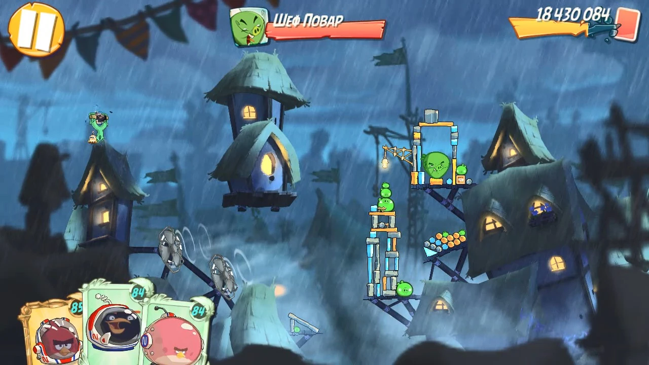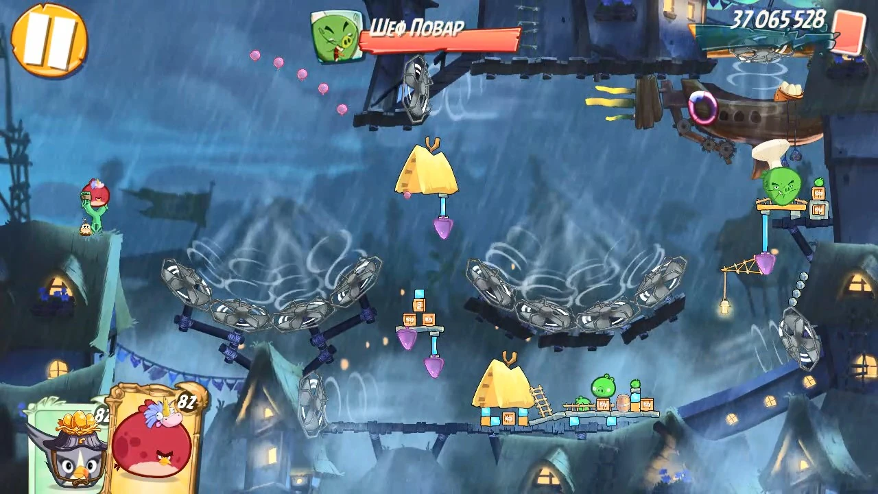 Как и на уровне 1006, пробейте соломенную крышу через середину, чтобы птица долетела до Шеф-Повара и подорвала динамит справа от него. Лучше всего с этим справляются Серебрянка (без активации способности) и Чак. Если всё прошло удачно (то есть Повар не застрял справа, ему не помешал упасть каменный кубик), то Повар упадёт в туннель справа и, сталкиваясь со строениями (если их случайно не уничтожила упавшая птица), начнёт получать урон. Затем запустите Теренса по той же траектории, и через некоторое время он упадёт около нижнего правого вентилятора и будет с силой продавливать Повара влево, нанося ему огромный урон. По крутой траектории над левыми вентиляторами запустите Матильду или Бомба, чтобы они упали в промежуток между группами вентиляторов и добили Повара, его здоровье не запредельно уж и велико.
