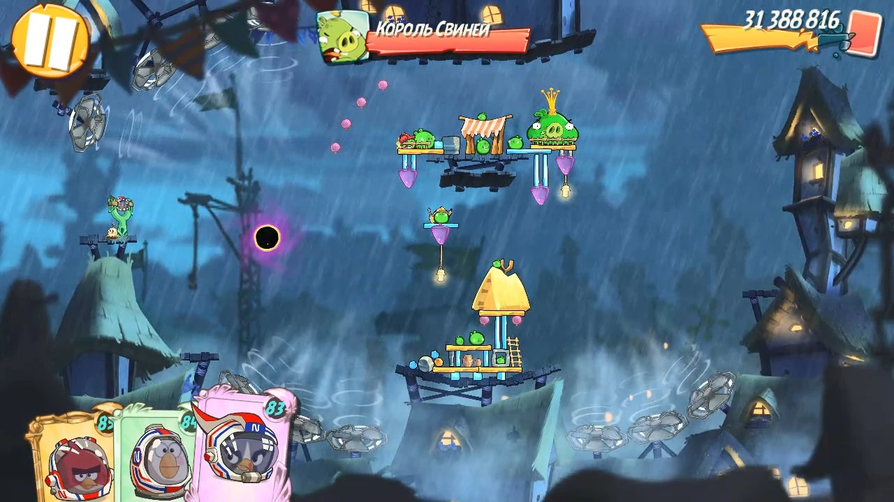 6 комнат. Наибольшую сложность представляют 3-я и 4-я, в которых по 3 здания. К 5-ой комнате сохраните Бомба, чтобы взорвать как можно больше шариков. Уровень основан на 1280-м, но с некоторыми отличиями: 1) вверху появился свин-пироман; 2) вентиляторов вверху справа больше нет, вместо них дыра; 3) появилась гравитационная аномалия, которая ранее встречалась только в «Космическом приключении». Эта аномалия способна искривлять путь или ускорять птицу, в зависимости от относительного положения траектории. Чтобы сбросить Короля свиней, можно либо сбить строителя и запустить птицу по освободившемуся пути (оба этих действия в один приём может выполнить Матильда), либо сбить пиромана и запустить птицу через верх. Начнутся скитания Короля по уровню, которые могут окончиться либо за рогаткой (если его туда выбросит аномалия; в этом случае уровень пройден), либо на площадке, ближайшей к рогатке (тогда выбейте Короля как можно сильнее, чтобы он вылетел прямо в дыру в верхней правой части, но, скорее всего, он зацепится), либо на нижней центральной площадке (столкните его оттуда на вентиляторы; опять же есть шанс, что он вылетит с уровня). Если есть Стелла, Короля можно вынести в пузыре с любой из центральных площадок, и с большой вероятностью он вылетит с уровня). Если же птиц достаточно много (например, в Панике Короля свиней или облегчённом режиме), можно дождаться, пока Король, столкнувшись много раз со стенами, не разобьётся.