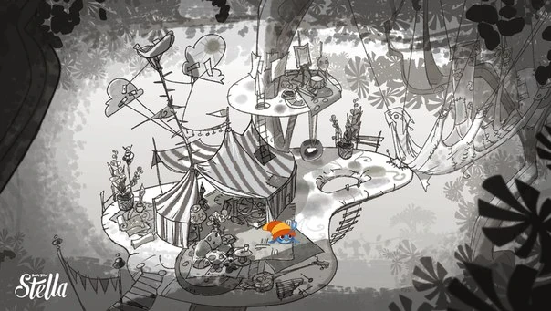 Жилище, к слову, является более похожим на цирковой шатёр, нежели на обычный дом. Рядом укреплена замысловатая конструкция, напоминающая флюгер — высокий столб с прикреплёнными к нему бумажными облаками. Повсюду разбросаны различные вещи — бумаги, небольшие коврики, чернильница с пером, кисточки, краски, цветы и подушки. К стволу дерева, чуть выше шатра, прикреплена маленькая площадка, на которой установлен мольберт. В качестве развлекательных игрушек предусмотрен огромный гамак и колесо, привязанное к площадке (его можно использовать, как качели).