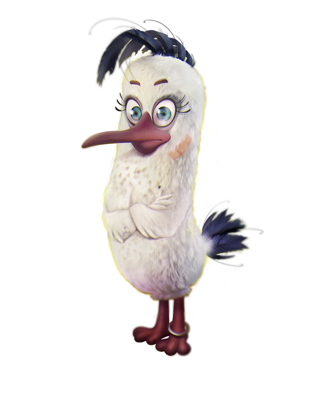 Представляет из себя белую птицу вытянутой формы с белыми крыльями и фиолетовыми лапами среднего размера. Клюв фиолетовый, треугольный, закруглённый, верхняя часть вытянута вперёд. Глаза овальные, серо-синие, с большими ресницами и серыми кругами вокруг. Брови фиолетовые, маленькие. Причёска — несколько чёрных перьев, наклонённых вбок. Имеет пластырь на щеке.