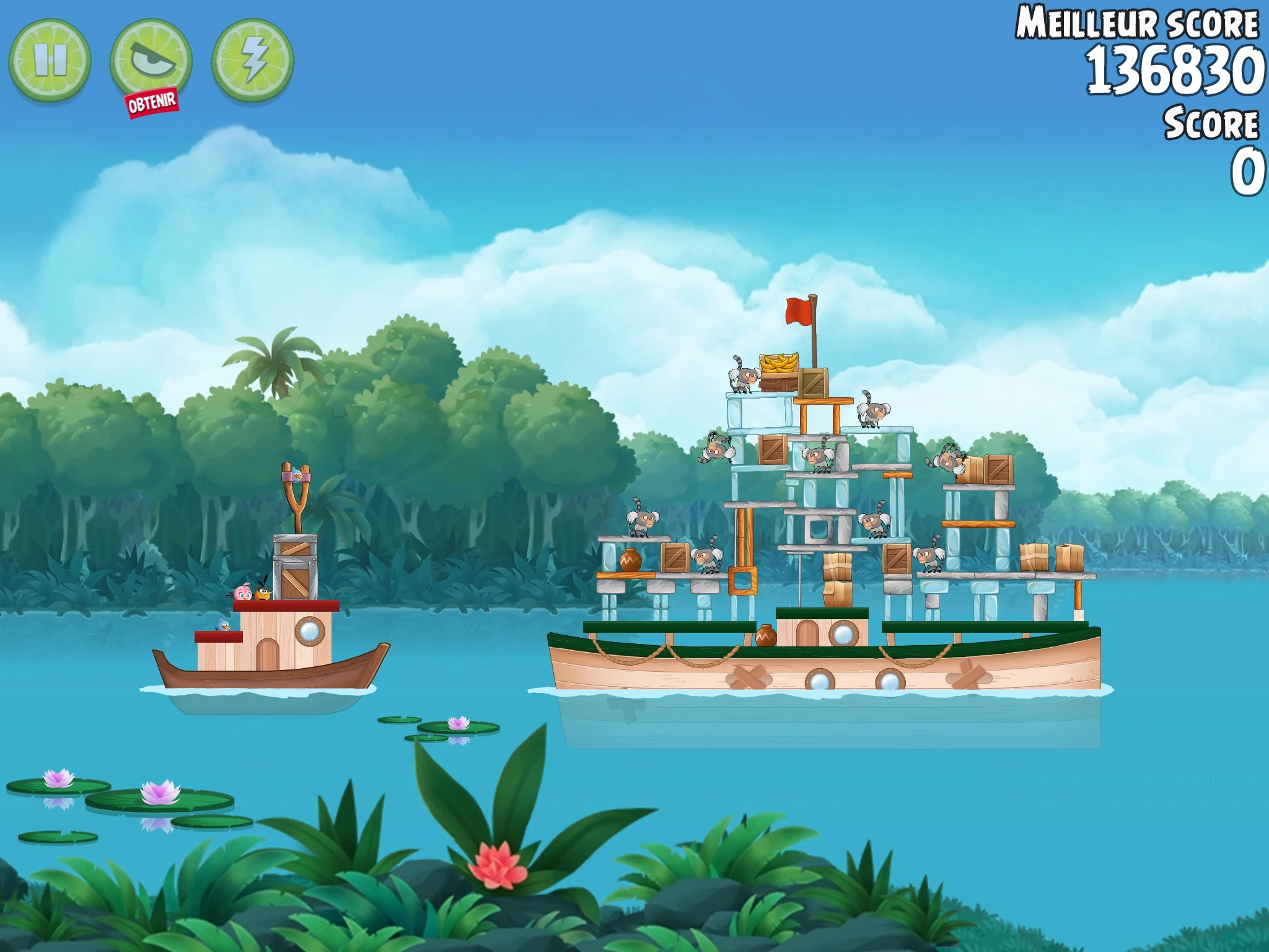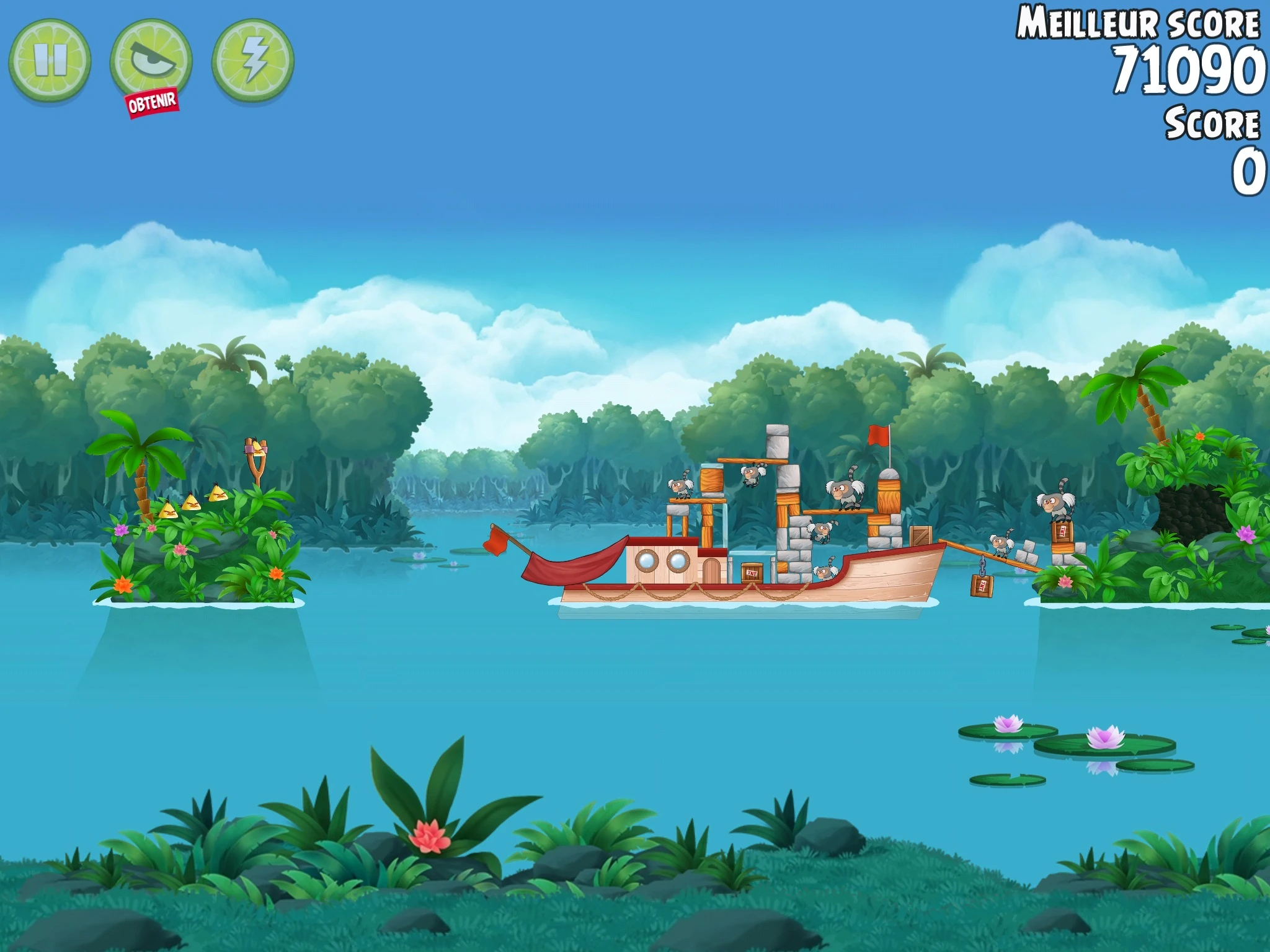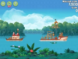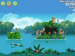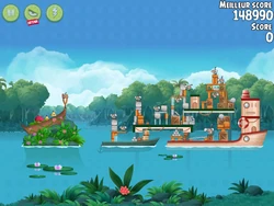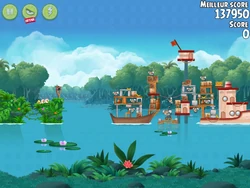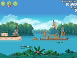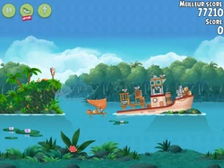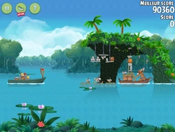 Бабблзом ударьте по верхнему динамиту, Чаком — по передней постройке. Оставшимися птицами уничтожайте блоки. Банку с сардинами запустите в выживших обезьян. Вот и всё.