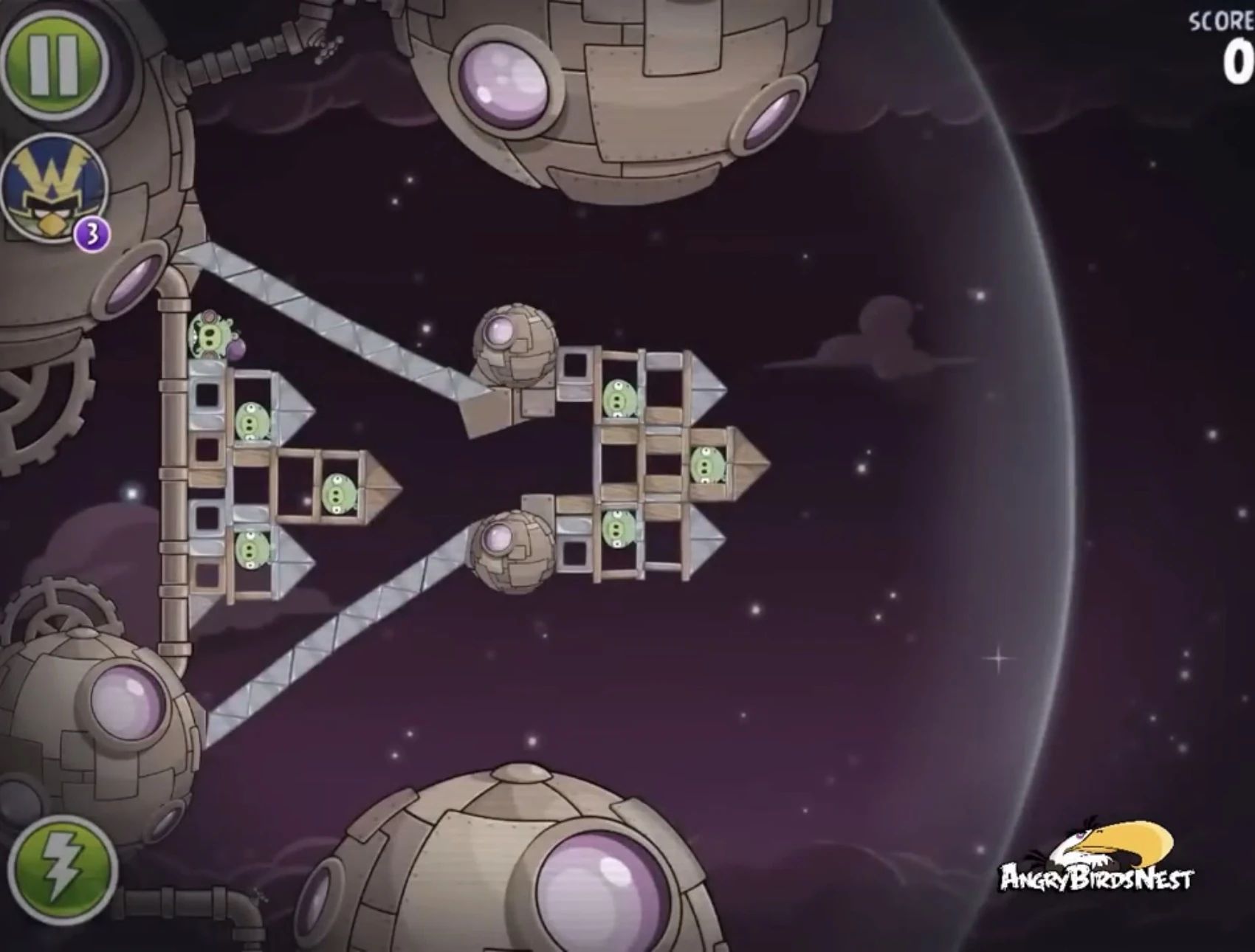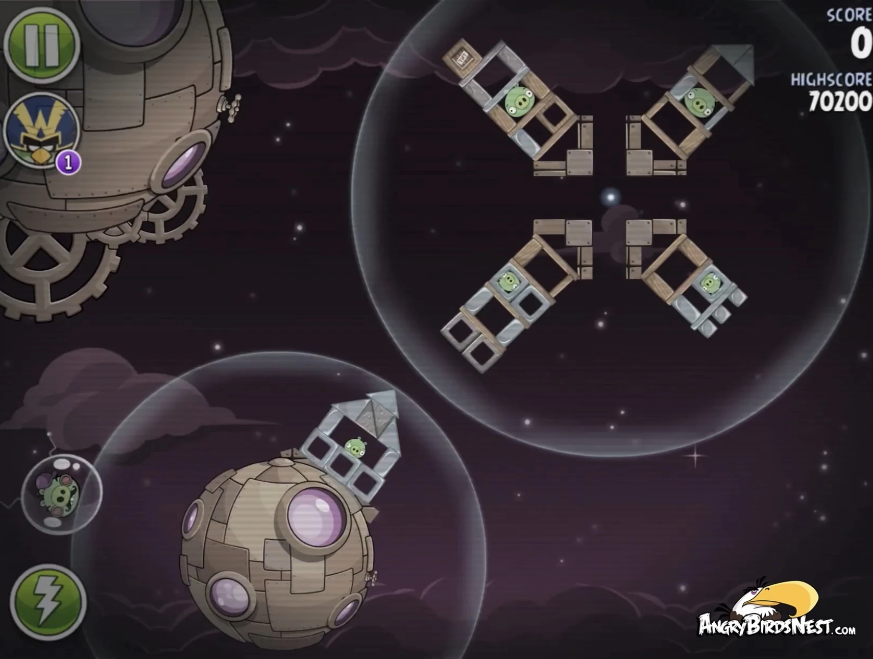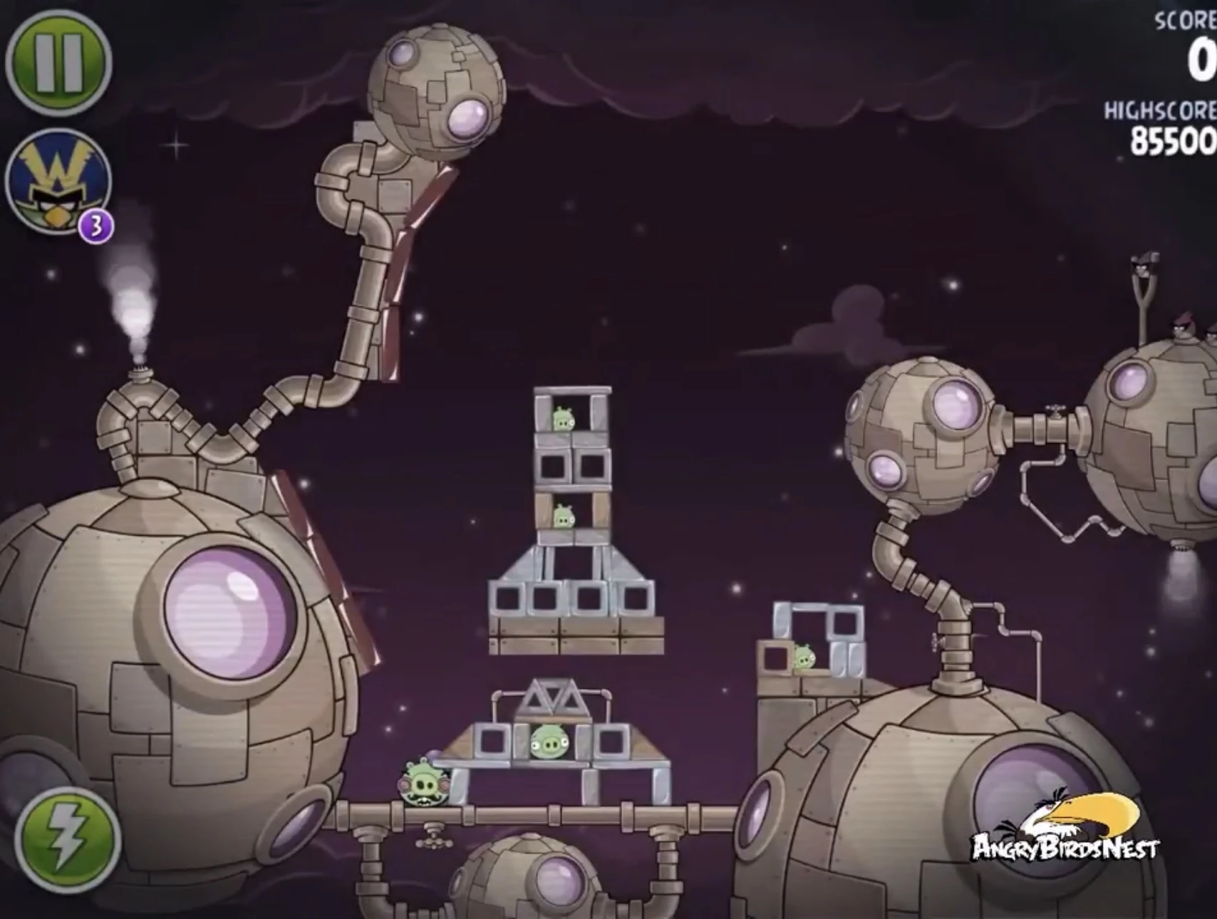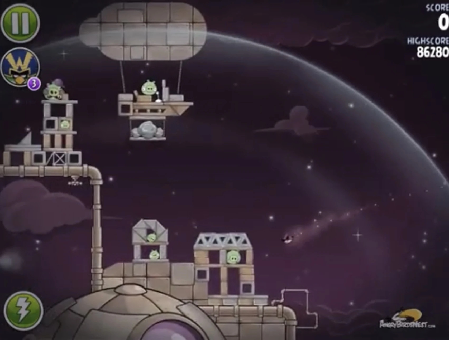 Попадите Чаком в трёх свиней, сидящих в пузырях (один из них на цепях держит динамиты), после чего они упадут и подорвут несколько построек. Далее Синей троицей с помощью её способности разрушьте две постройки на ближайшей к рогатке медной планете. Вконец вторым Чаком добейте Гектора Порко.