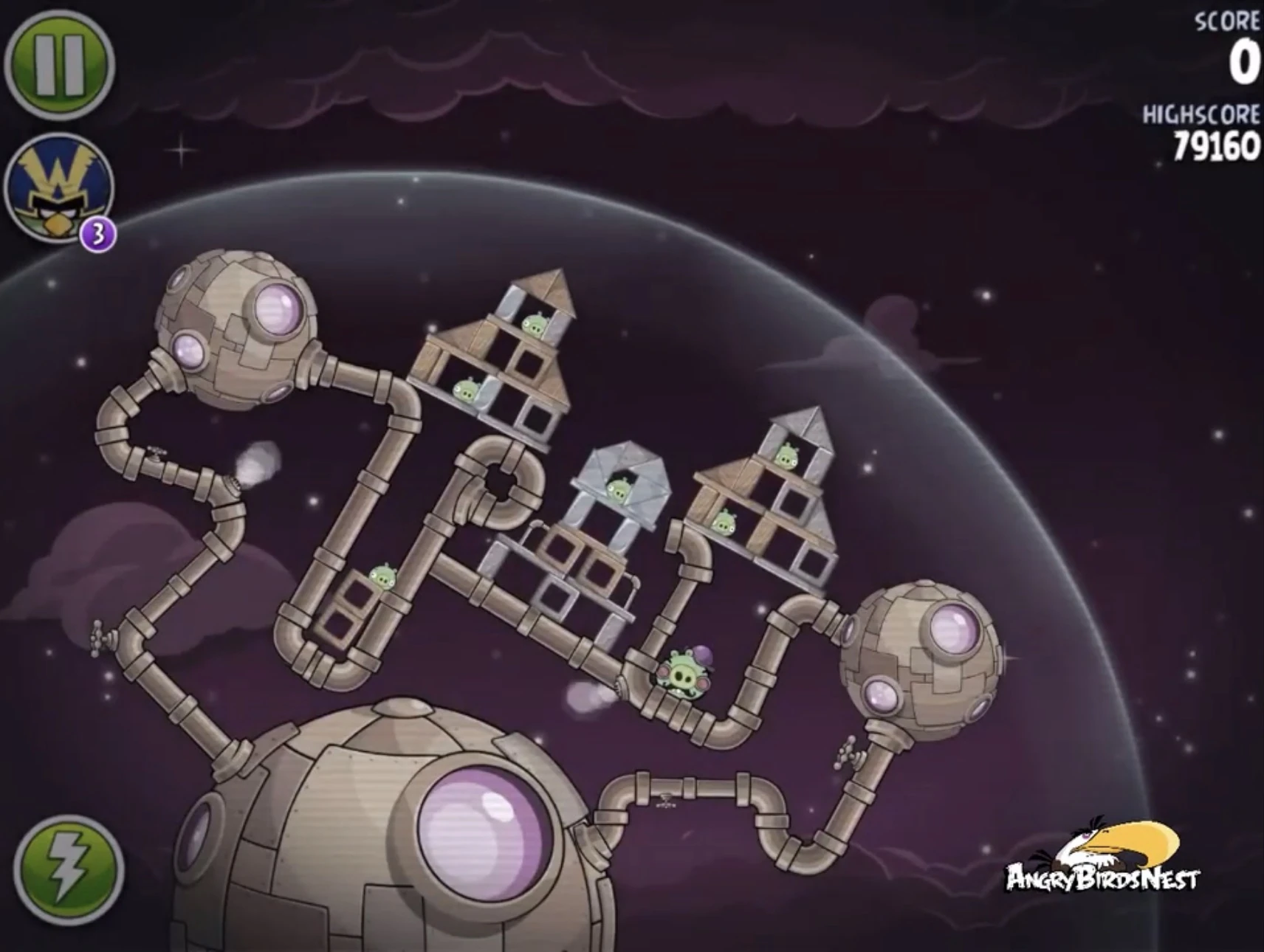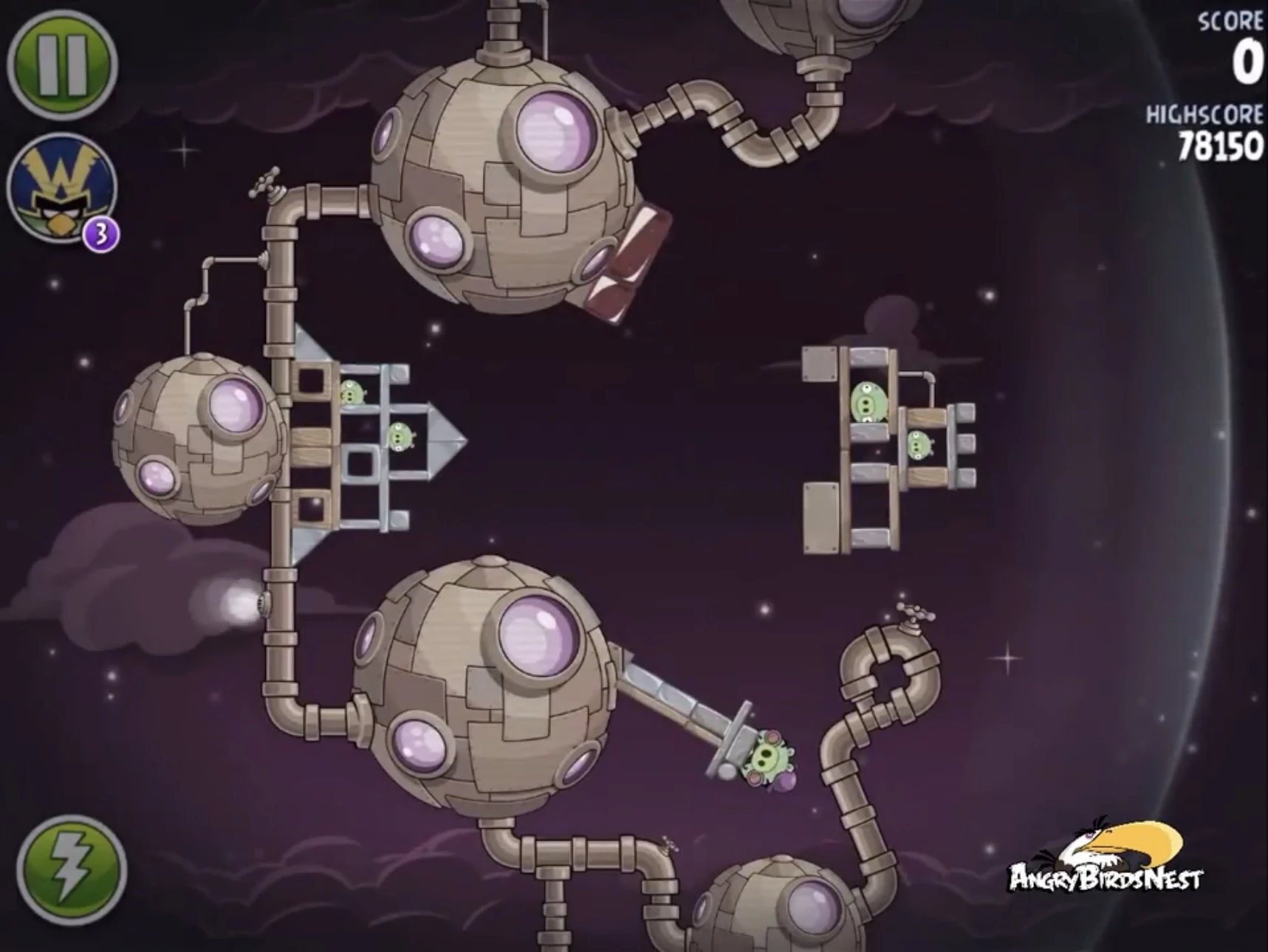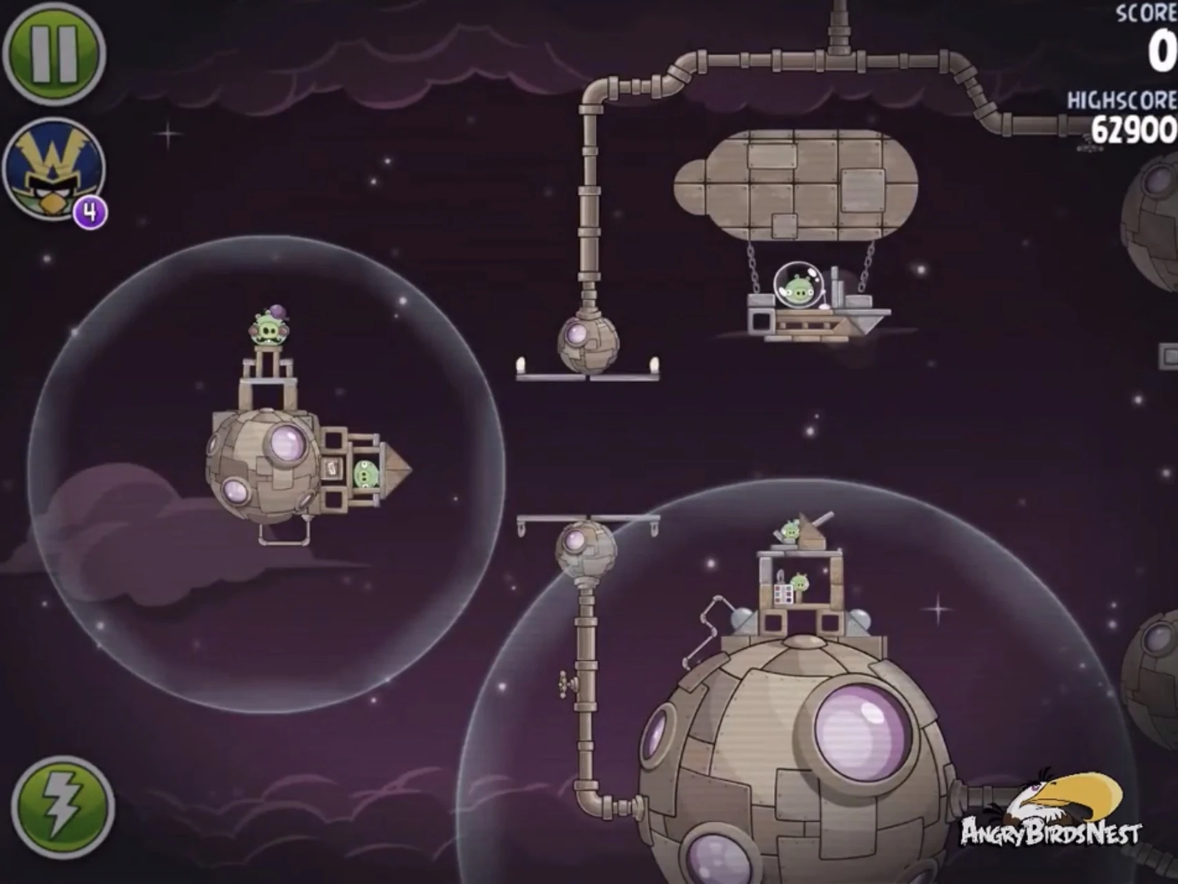 Попадите Чаком в трёх свиней, сидящих в пузырях (один из них на цепях держит динамиты), после чего они упадут и подорвут несколько построек. Далее Синей троицей с помощью её способности разрушьте две постройки на ближайшей к рогатке медной планете. Вконец вторым Чаком добейте Гектора Порко.