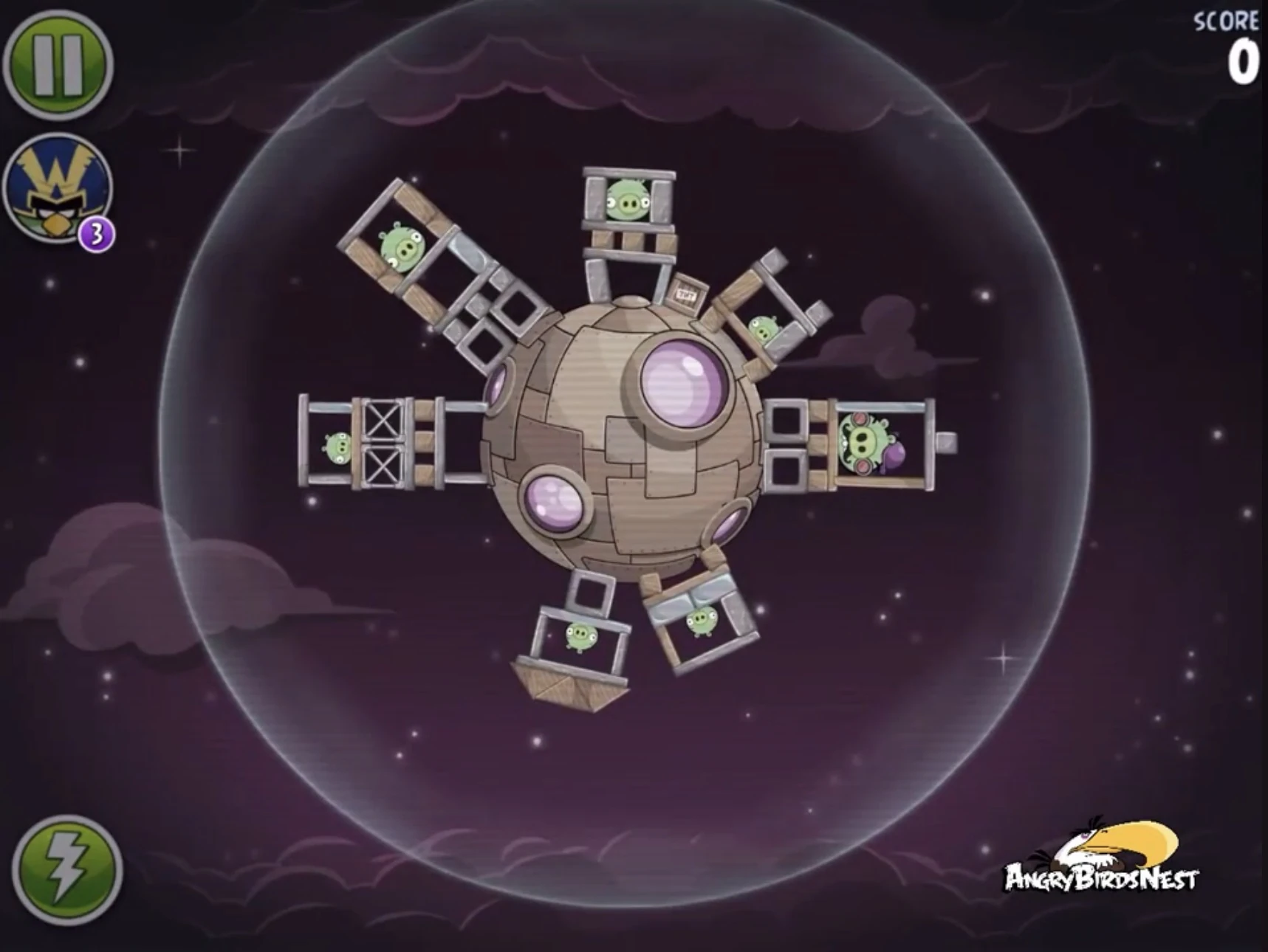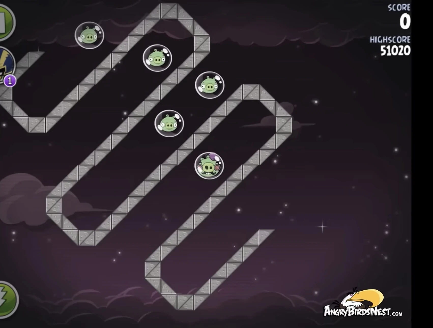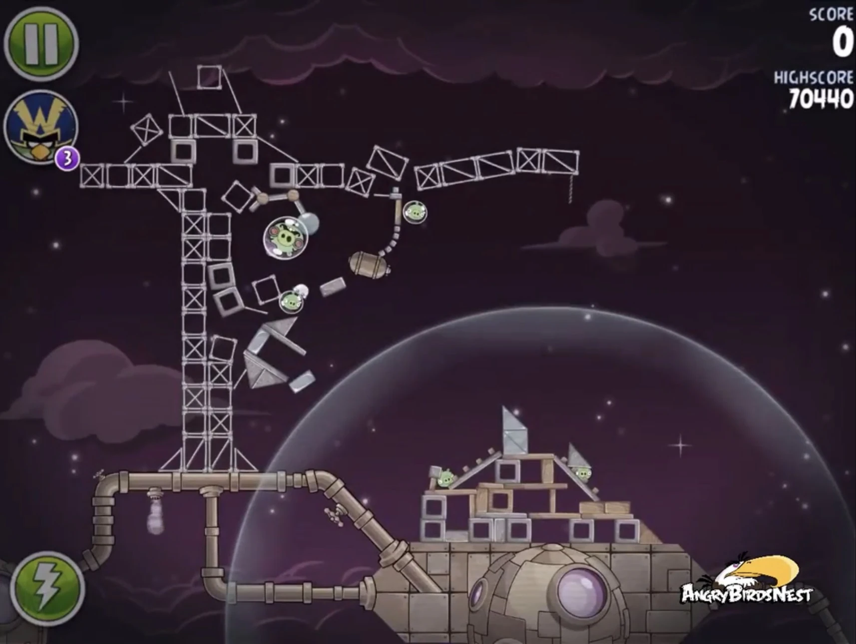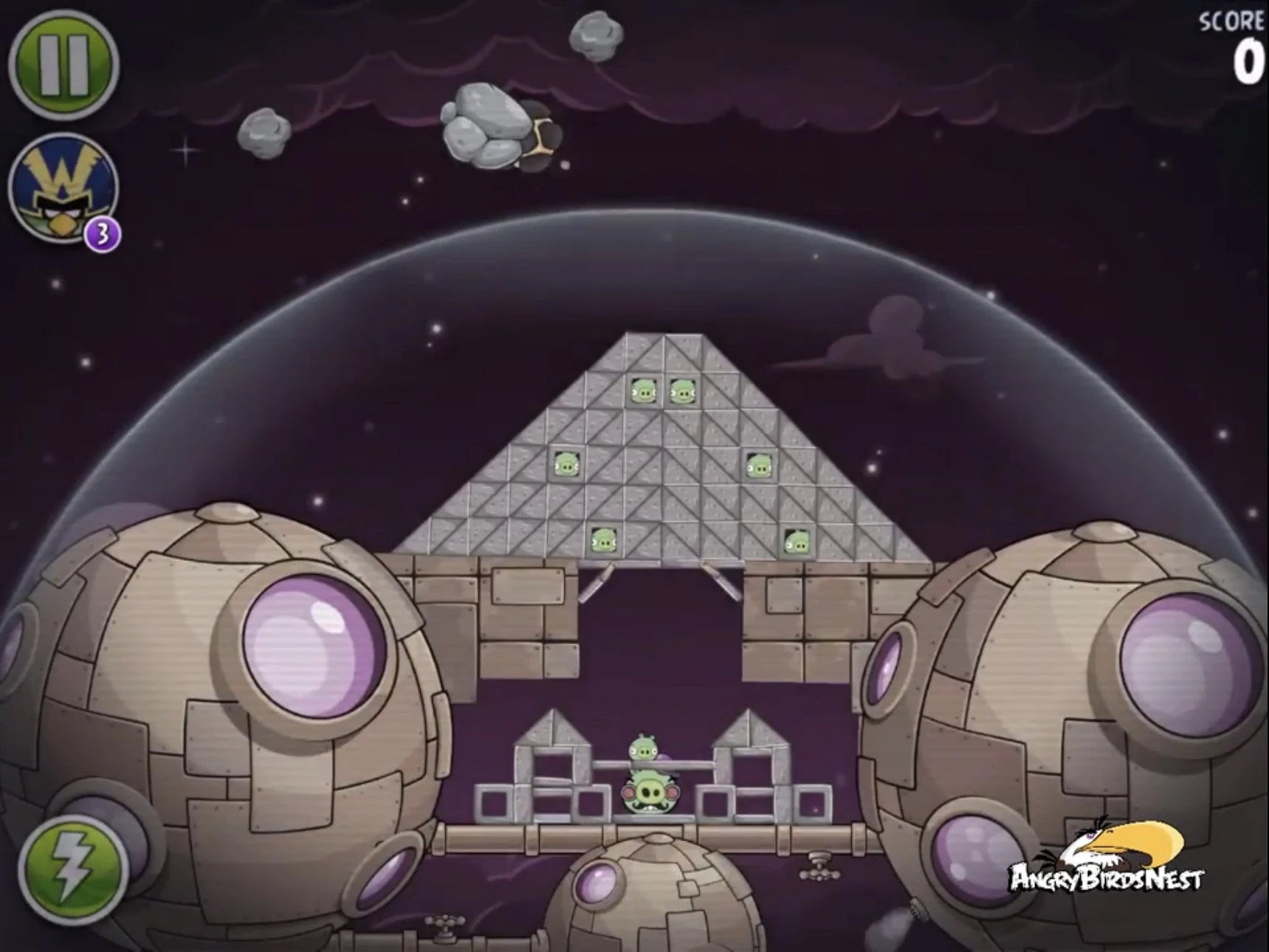 Попадите Чаком в трёх свиней, сидящих в пузырях (один из них на цепях держит динамиты), после чего они упадут и подорвут несколько построек. Далее Синей троицей с помощью её способности разрушьте две постройки на ближайшей к рогатке медной планете. Вконец вторым Чаком добейте Гектора Порко.