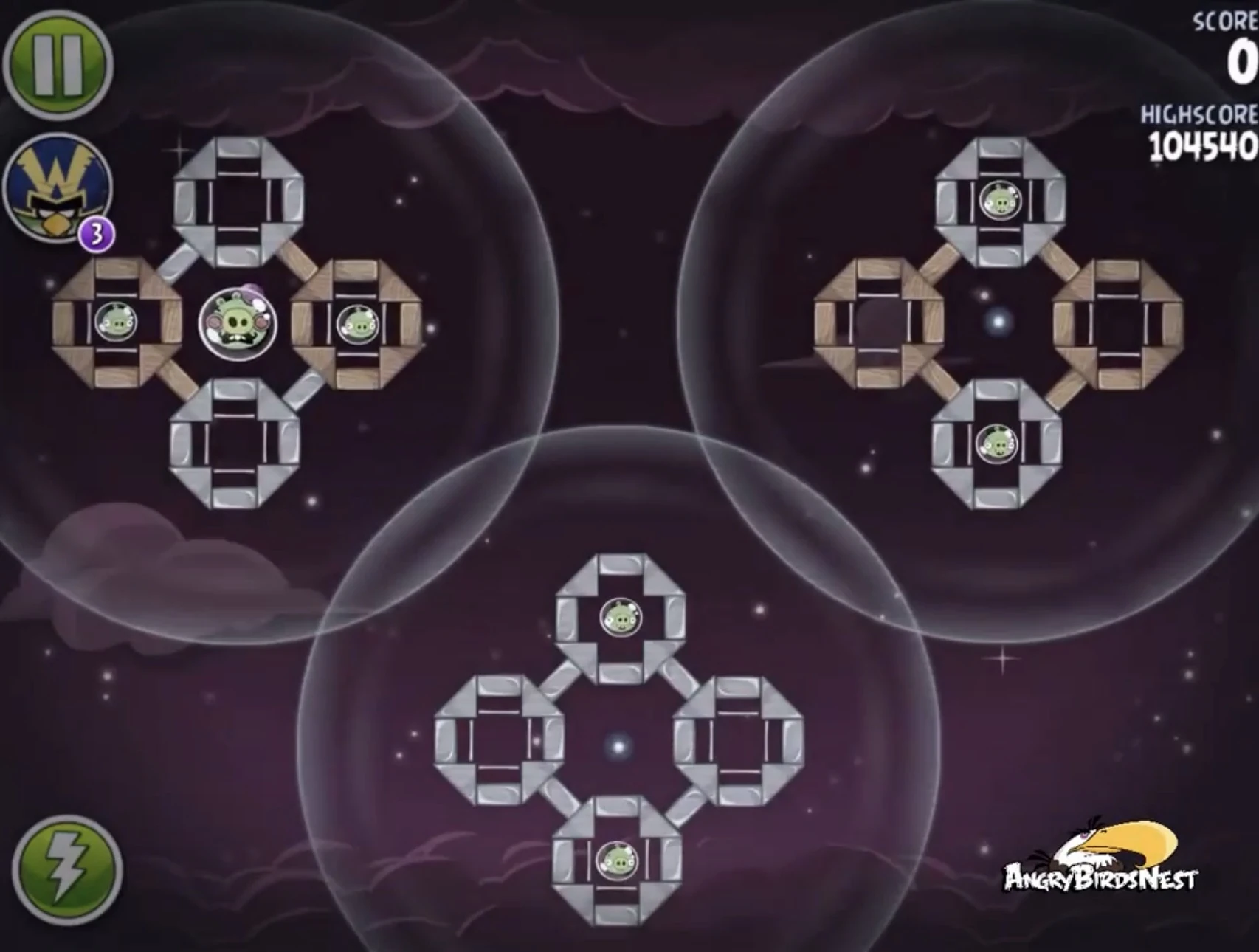 Разрушьте Чаком постройку, находящуюся в большой атмосфере. Затем Синей троицей добейте оставшихся свиней, всё зависит от удачи.