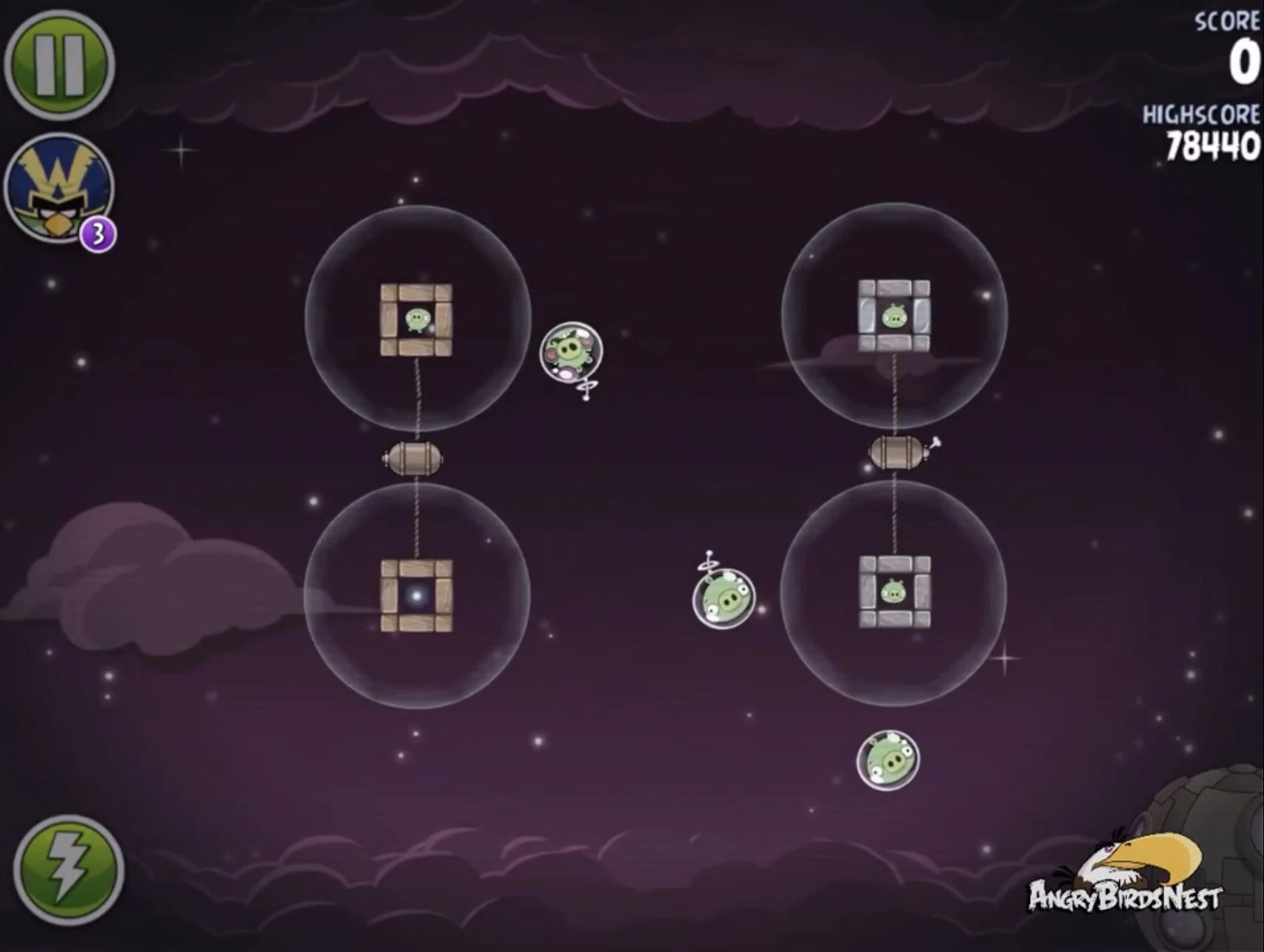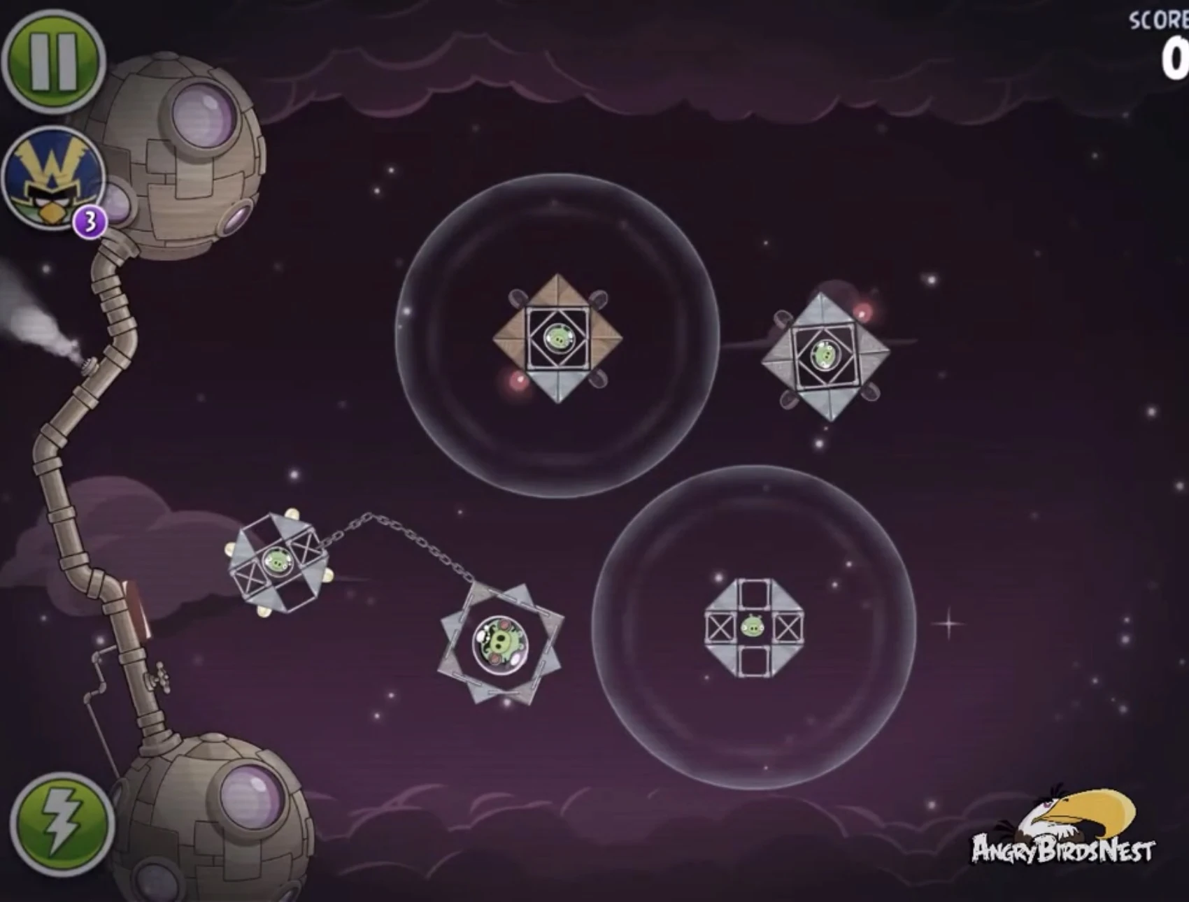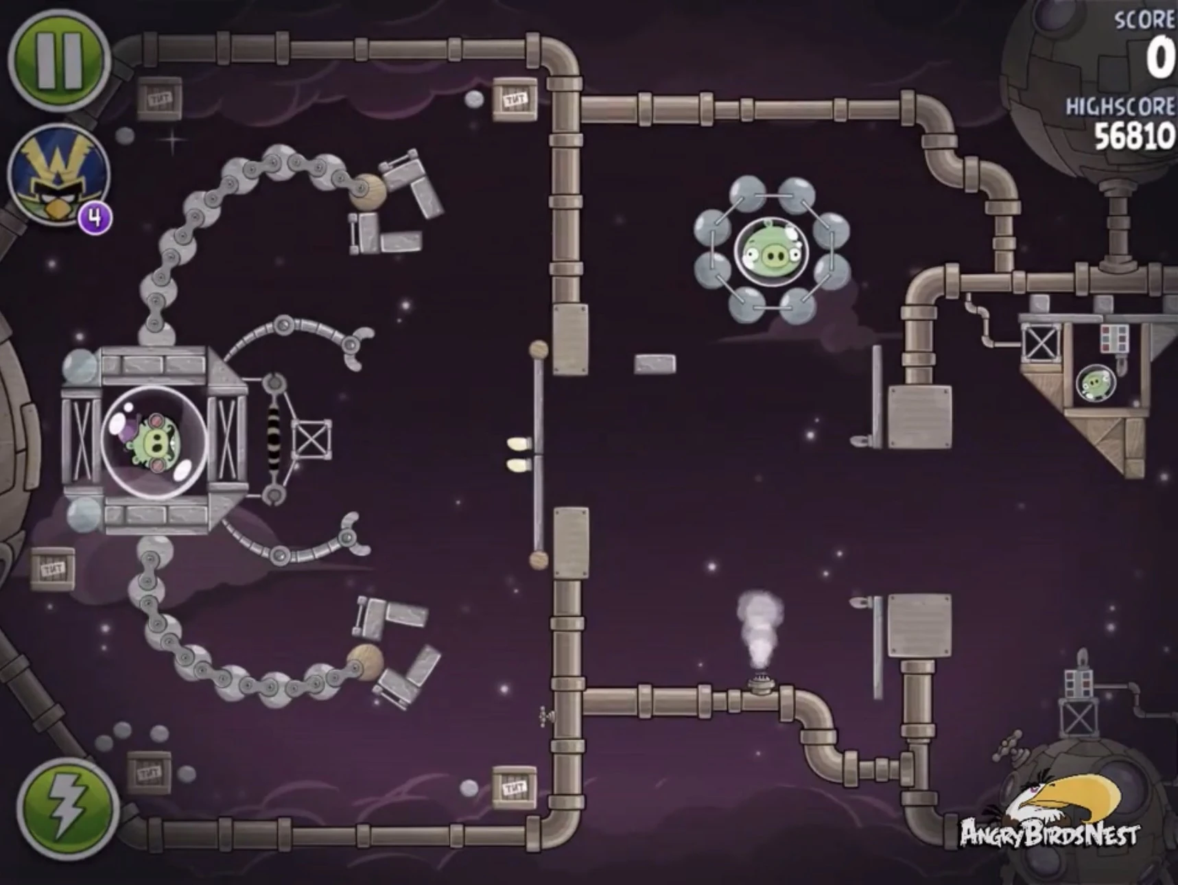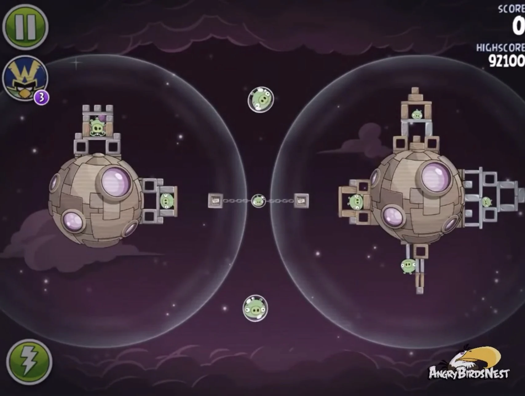Запустите Теренса в нижнюю атмосферу так, чтобы он попал в Гектора Порко и свина-миньона в постройках на цепи. Цепь отлетит и попадёт в миньона в верхней атмосфере. Реда запустите в ближайшего к рогатке свина-миньона так, чтобы он отскочил и попал в миньона в нижней атмосфере.