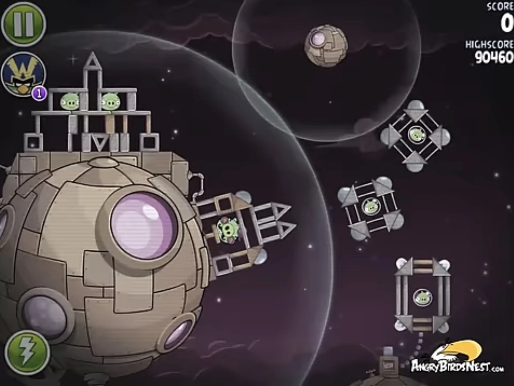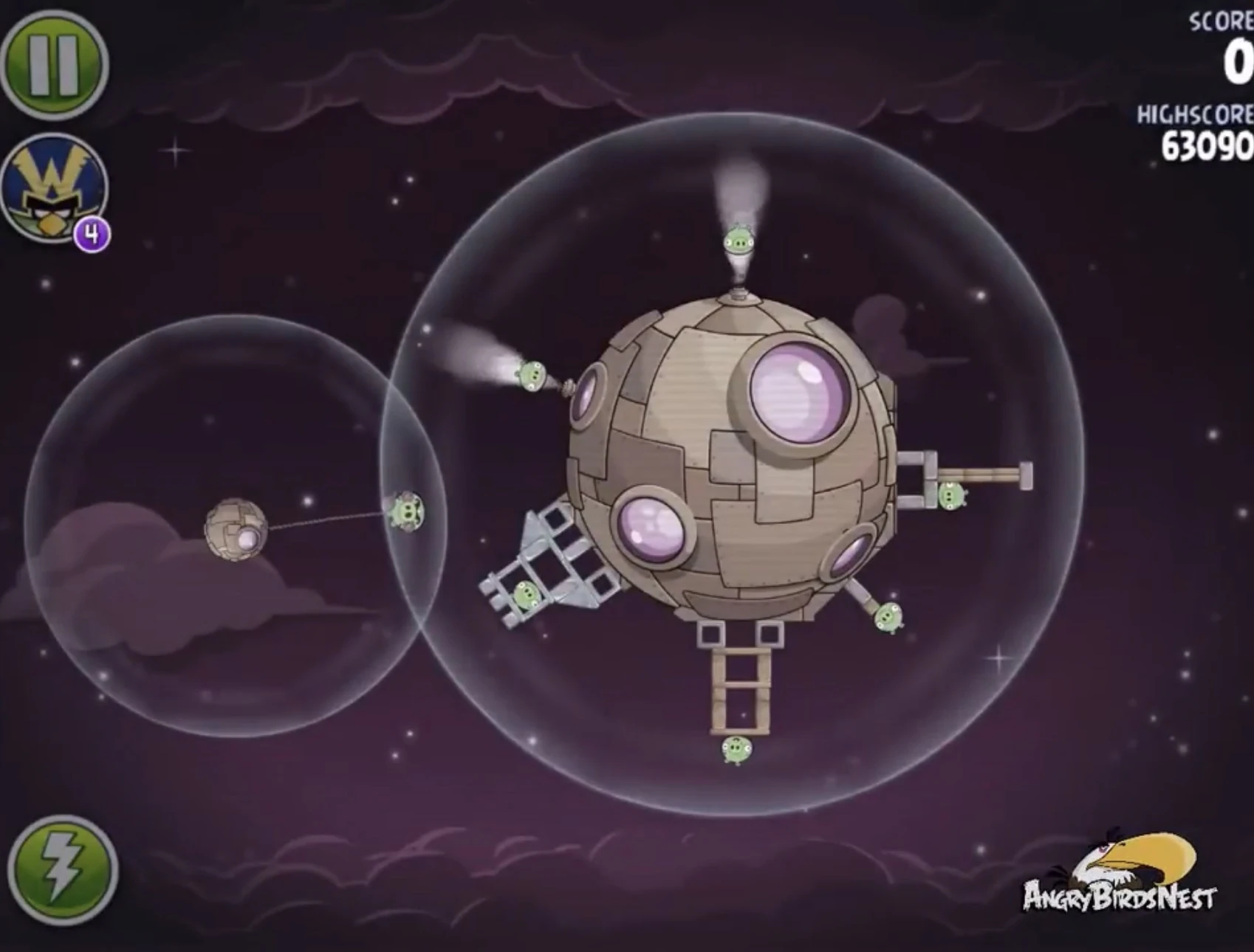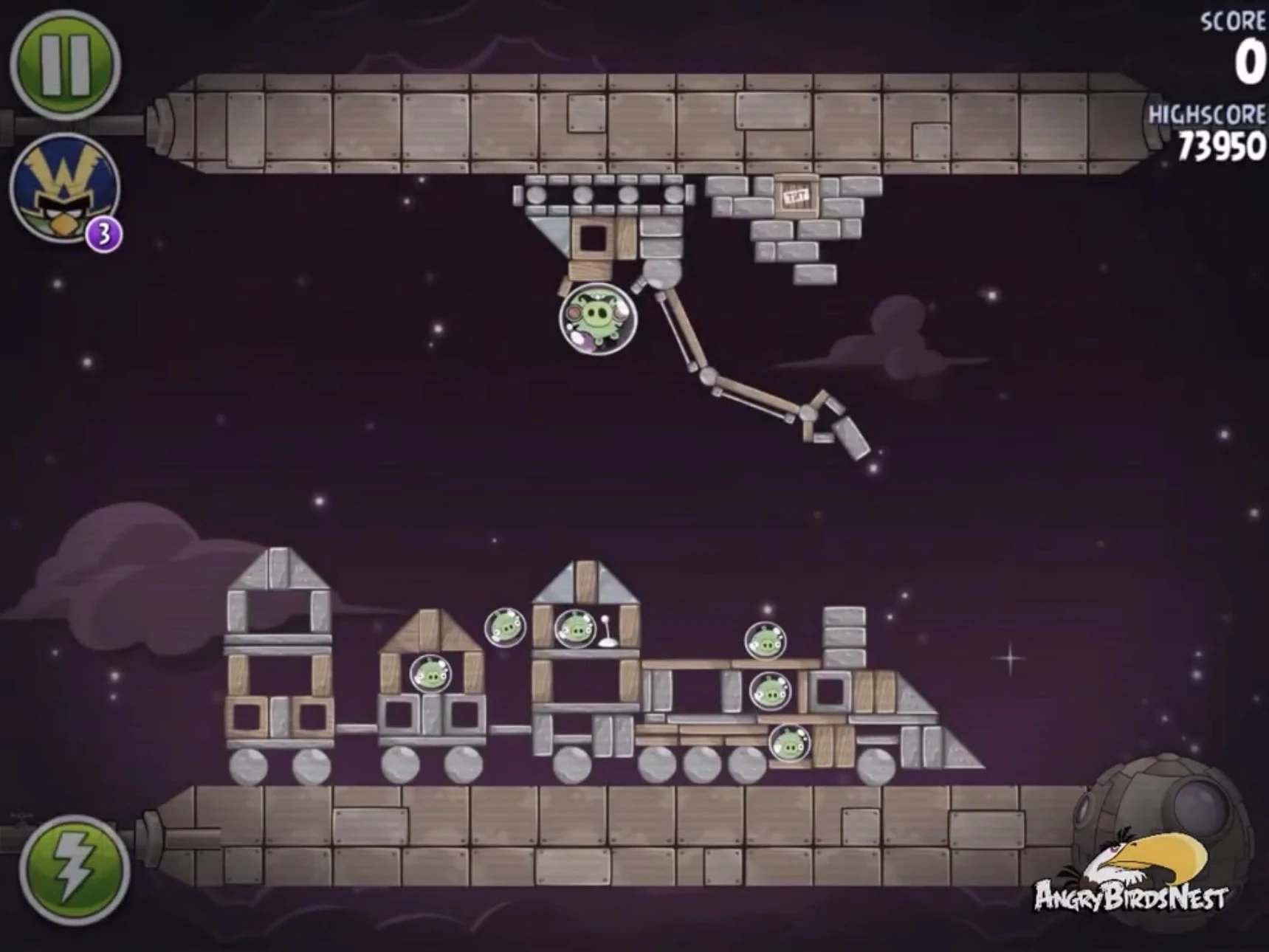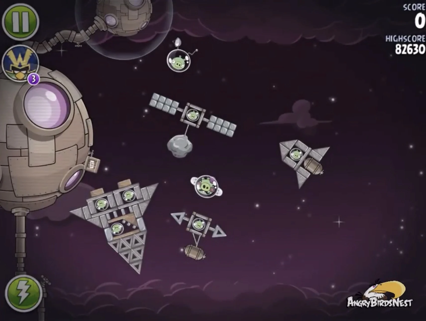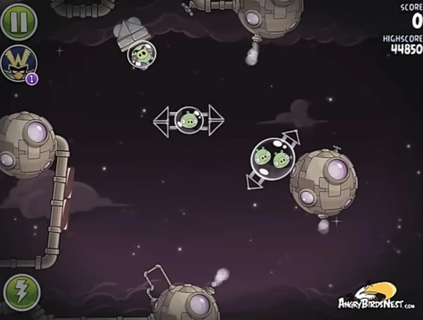Редом попадите в ближний к рогатке газовый баллон, после чего ракета заденет двух свиней-миньонов — одного в космической станции, а другого рядом с ней. Далее второго Реда запустите в газовый баллон в левом нижнем углу, после чего он направится на ракету и с помощью динамитов взорвёт её. Оставшегося миньона и Гектора Порко добейте Чаком. Если не получится, добейте Редом.