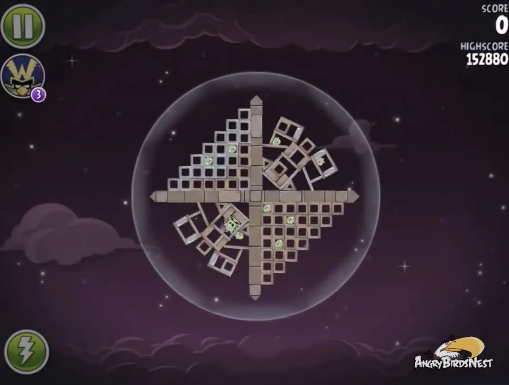 При помощи Синей троицы попытайтесь сделать так, чтобы она разрушила постройки в нижней и правой атмосфере. Есть шанс, что уцелеют максимум два свина. Затем Чаком разрушьте постройку в левой атмосфере. В конец второй Синей троицей добейте первого свина в правой постройке, а второго — в нижней постройке.