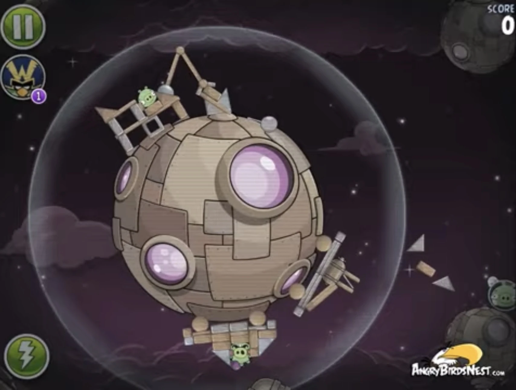 Реда запустите в в пар под ближайшей к рогатке планетой, после чего птах лопнет двух свиней в пузыре. Затем запустите Реда в то же место, но сделайте так, чтобы Красный отскочил от планеты в левом нижнем углу и попал в оставшегося миньона и Гектора Порко.