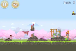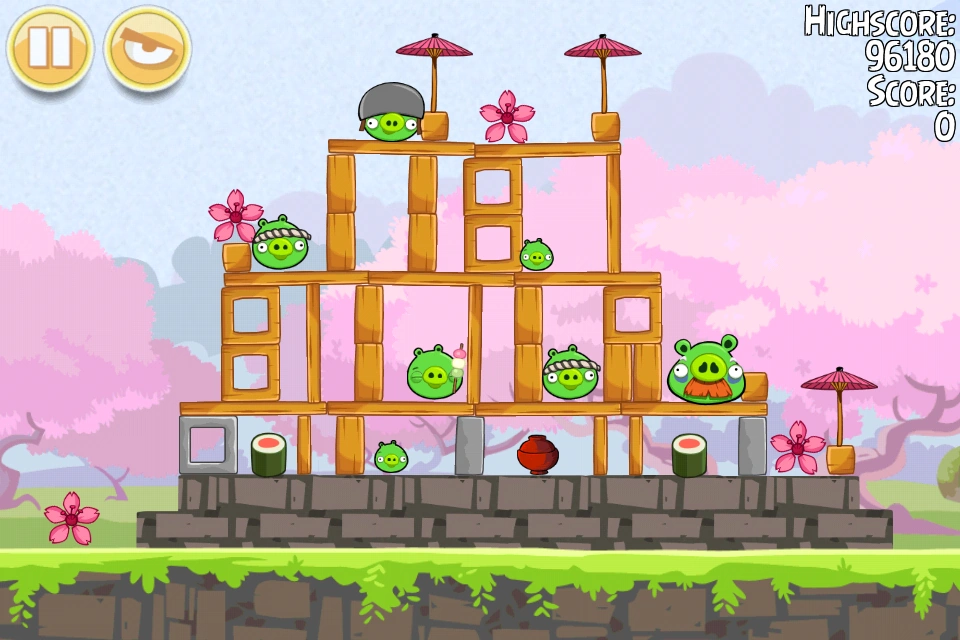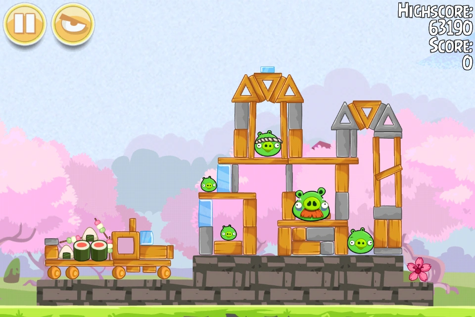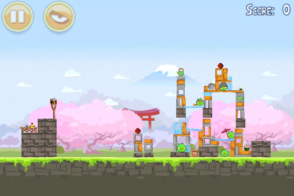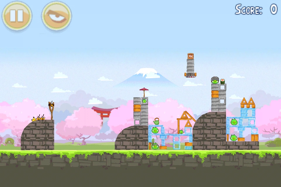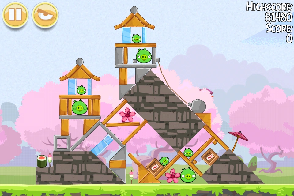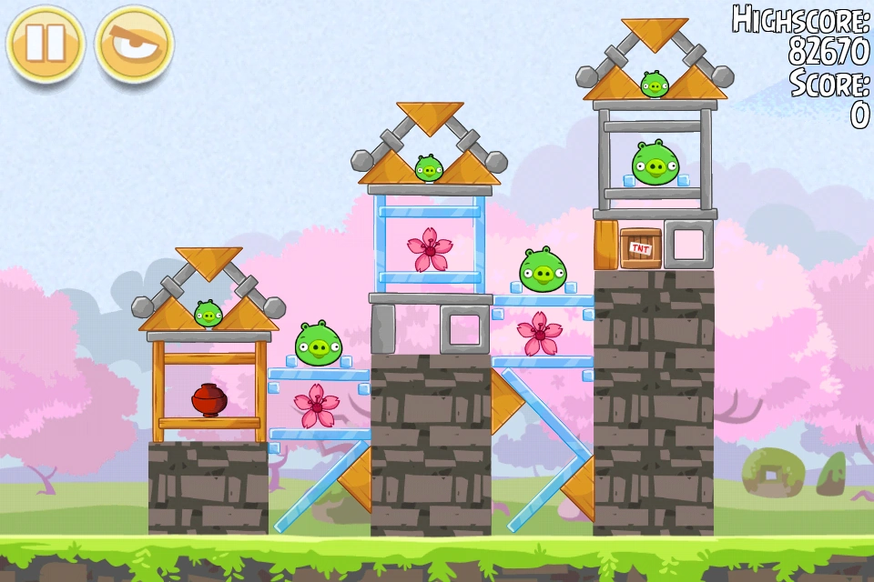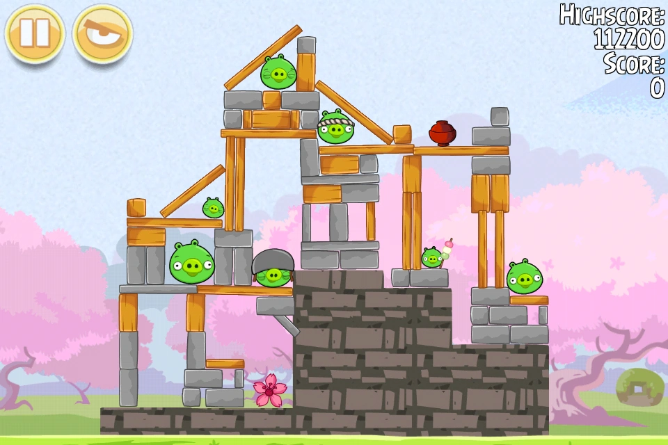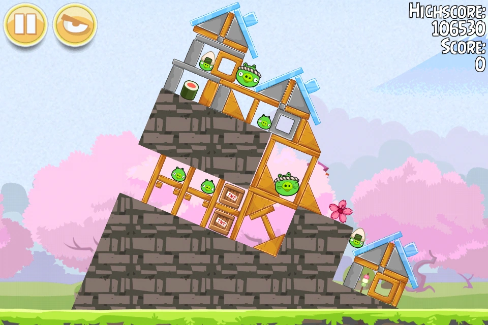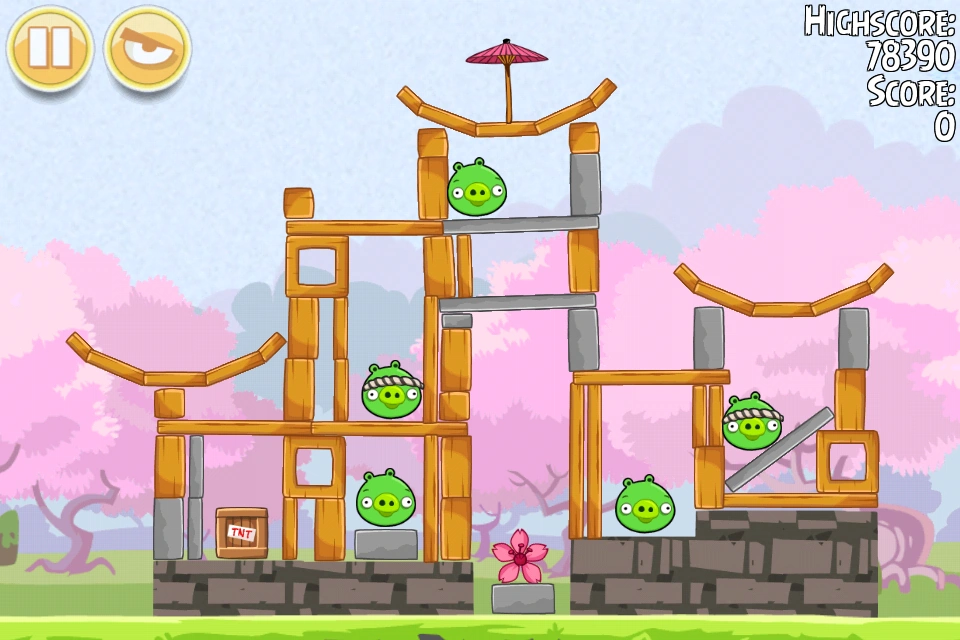 Стратегия проста: по очереди запускайте птиц по деревянным блокам влево чуть ниже центральной части, чтоб после уничтожения всех противников осталось две птицы в запасе.