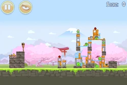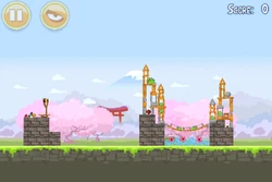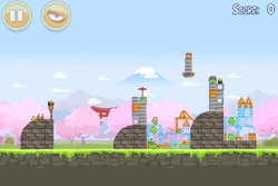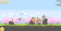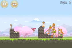 Сначала подбейте Чаком крайнее правое строение (ударьте по деревянным блокам). Второй удар будет от Бабблза, его киньте прямо влево, в самые ближние блоки к рогатке, после чего тот раздуется и уничтожит все блоки.