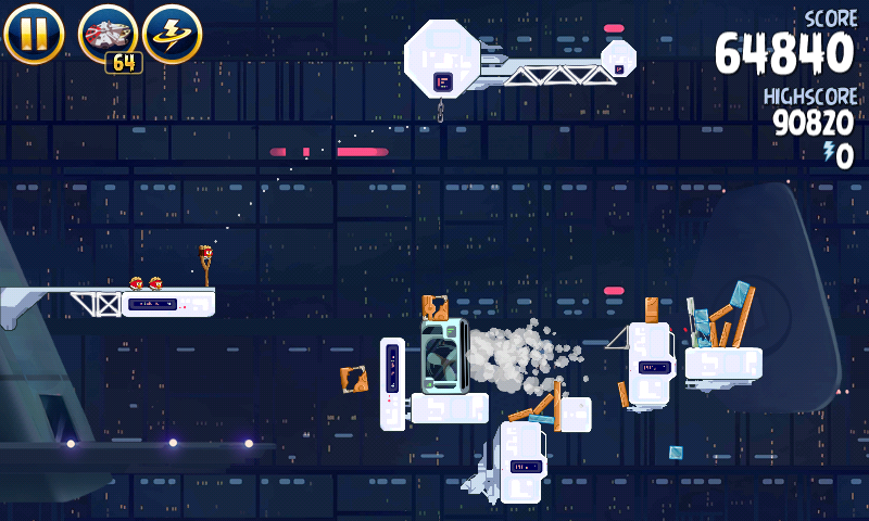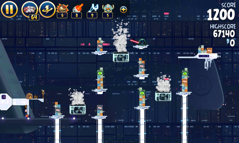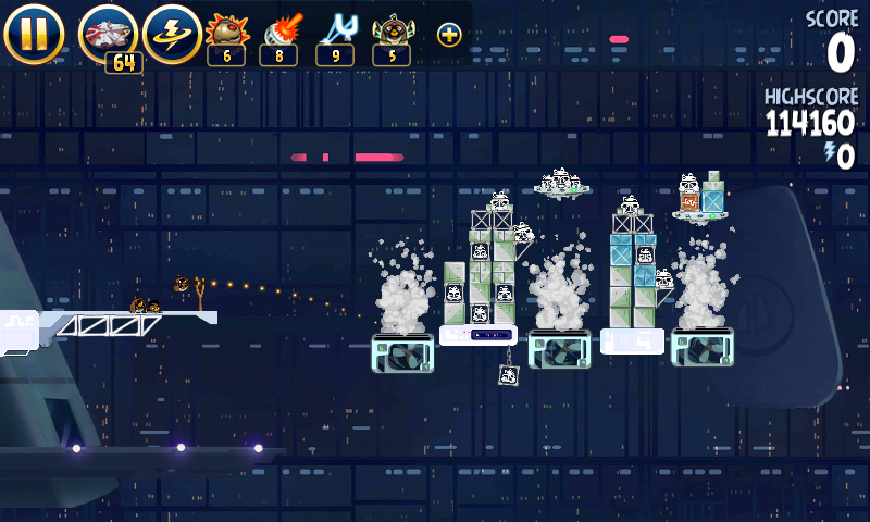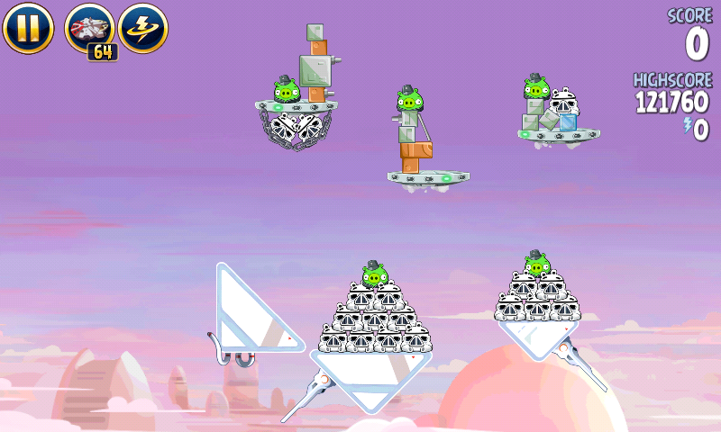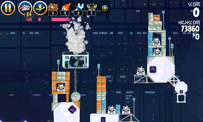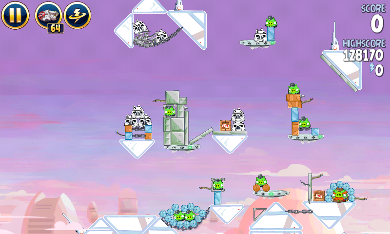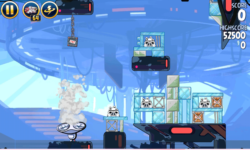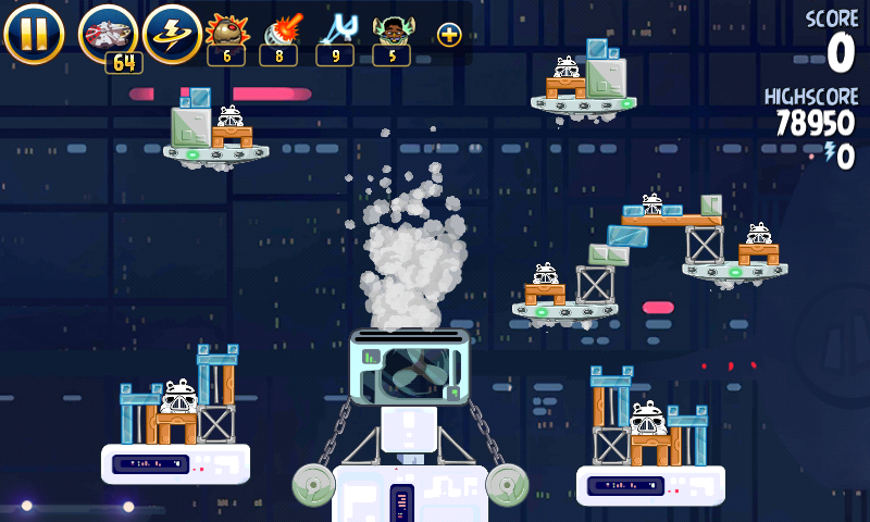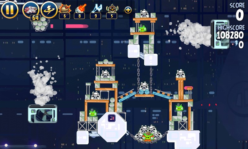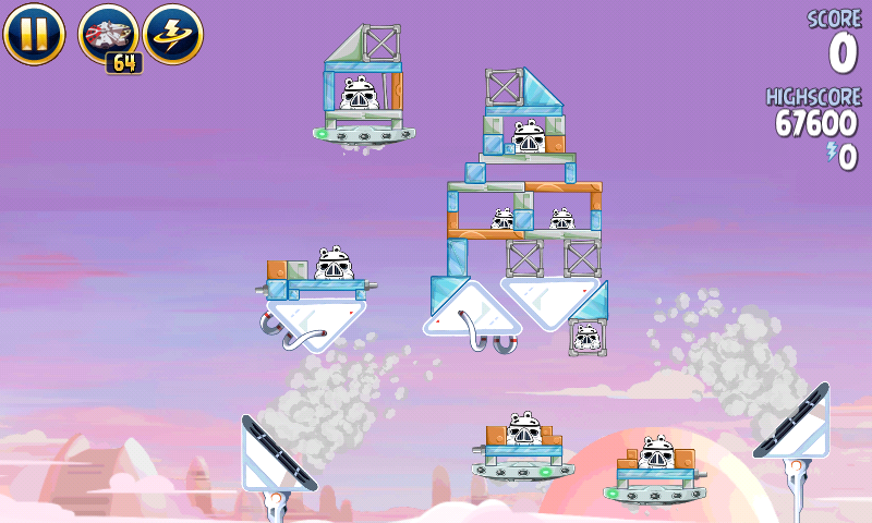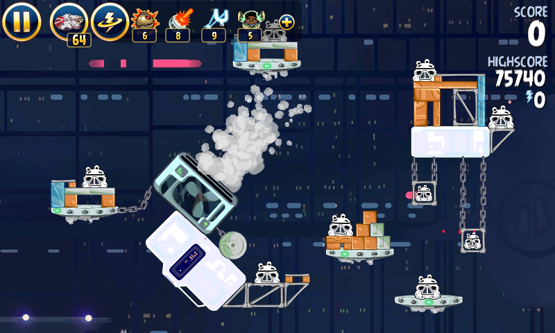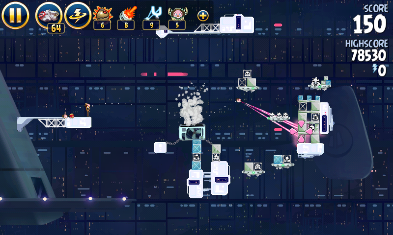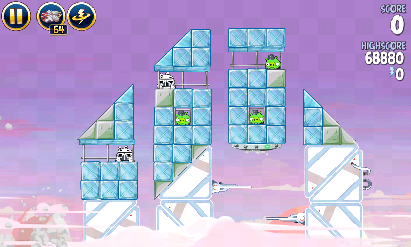Яйцо должно приземлиться на центральную платформу верхнего ряда; на ней сидит имперский штурмовик. Сокол обстреляет большую часть оставшихся построек, но в любом случае они упадут и свалят за собой остальные.