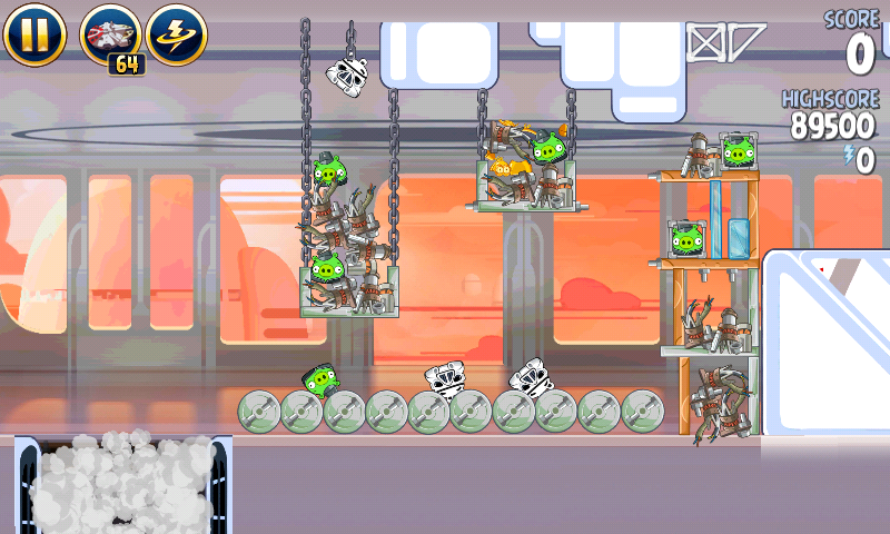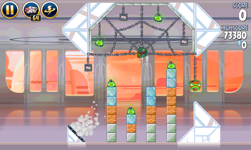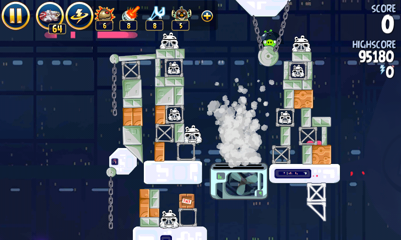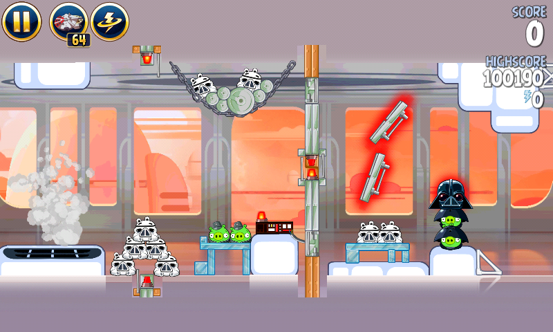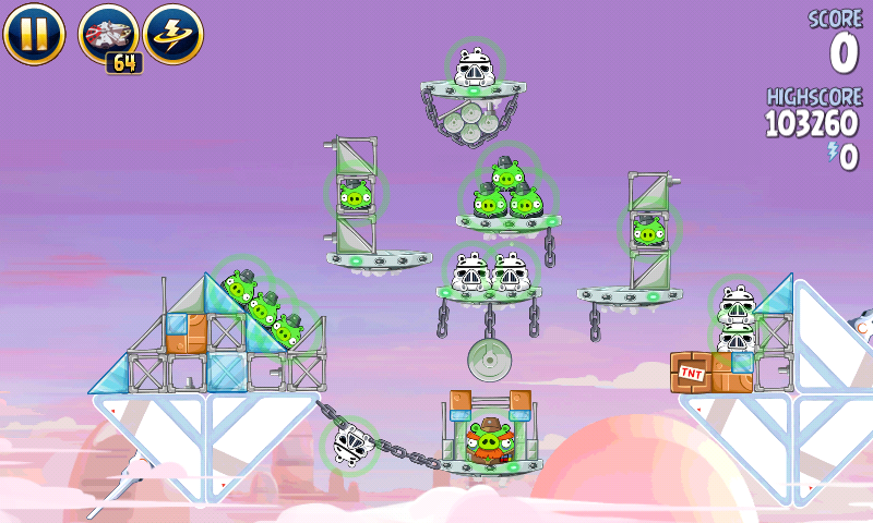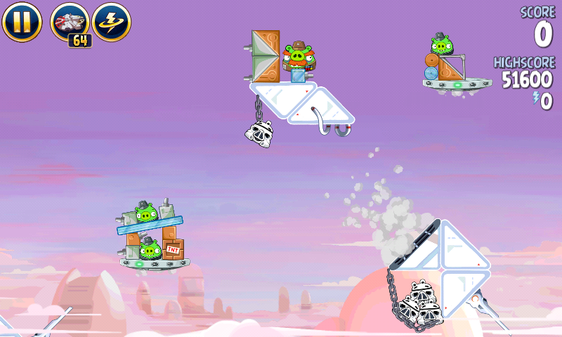 Запустите Лэндо в штурмовиков на цепях, и перед столкновением стреляйте в крайнюю правую башню. Запустите яйцо в оставшихся свиней.