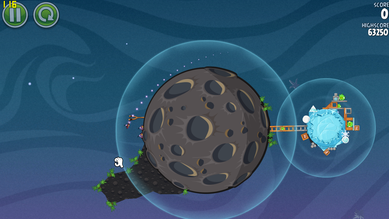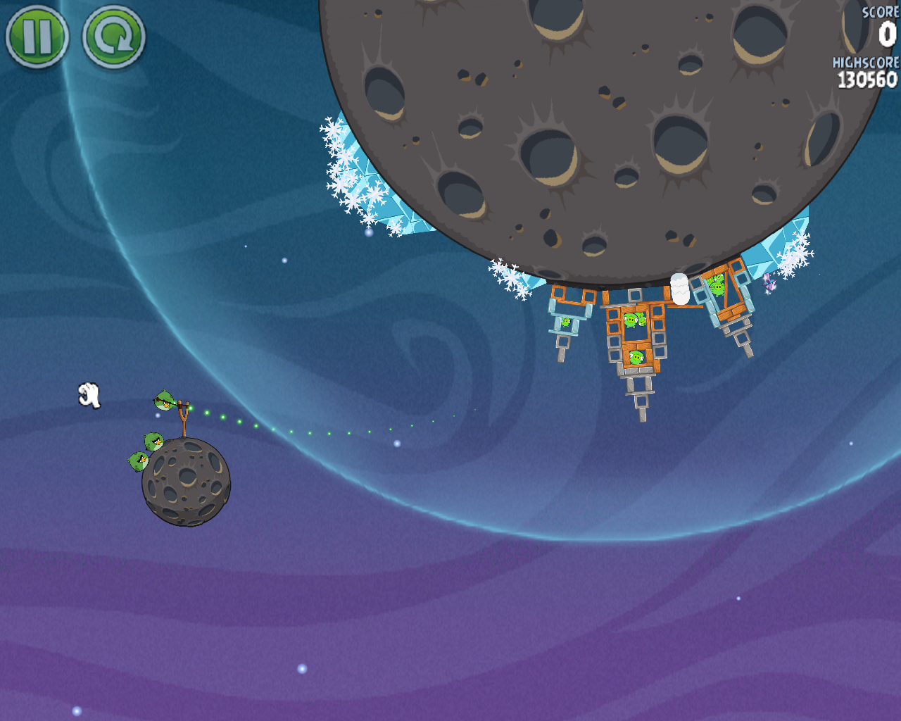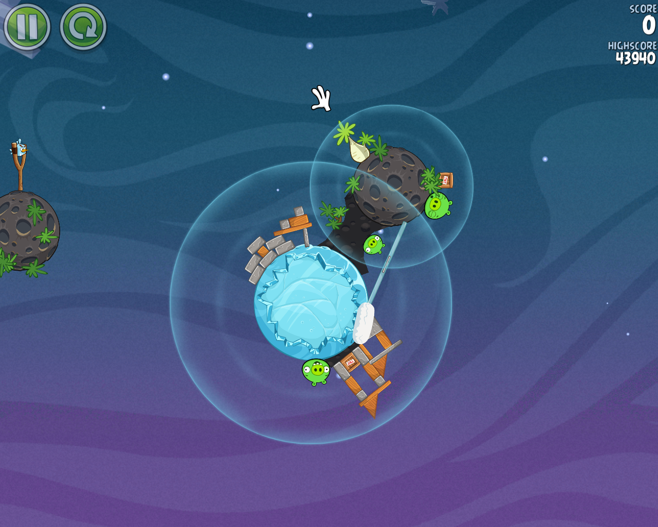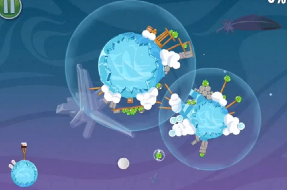 Это элементарный уровень. Запустите банку с сардинами так, чтобы она попала в своеобразную «лесенку», которая соединяет обе планеты. По цепной реакции все свиньи будут уничтожены.