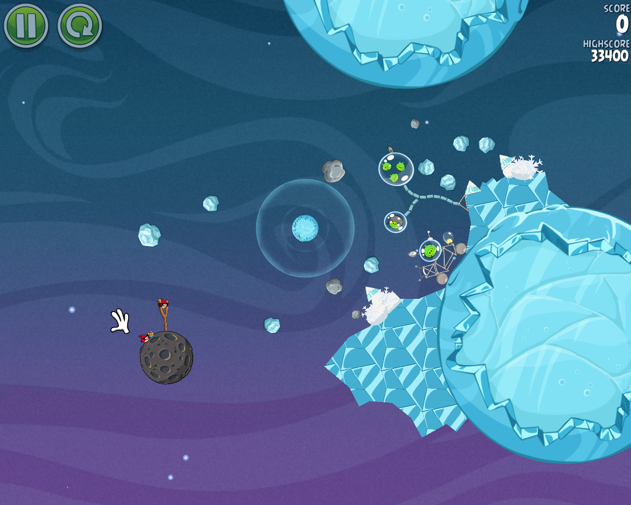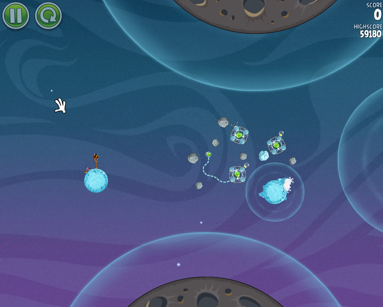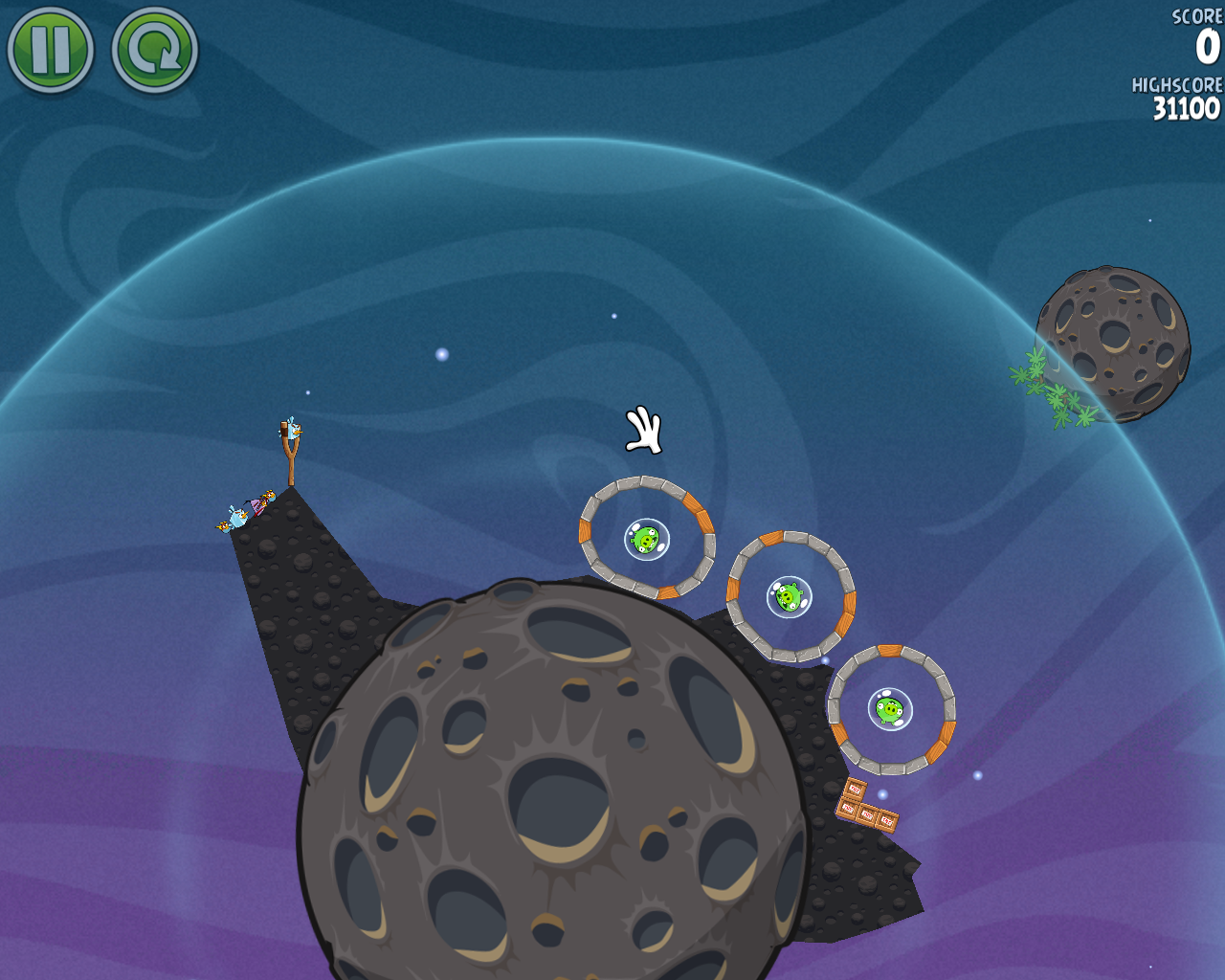 Это очень сложный уровень. Запустите банку с сардинами в камни так, чтобы их притянула орбита какой-нибудь планеты. Нужно, чтобы умерли все свиньи. Если вам это удалось, перо ваше.