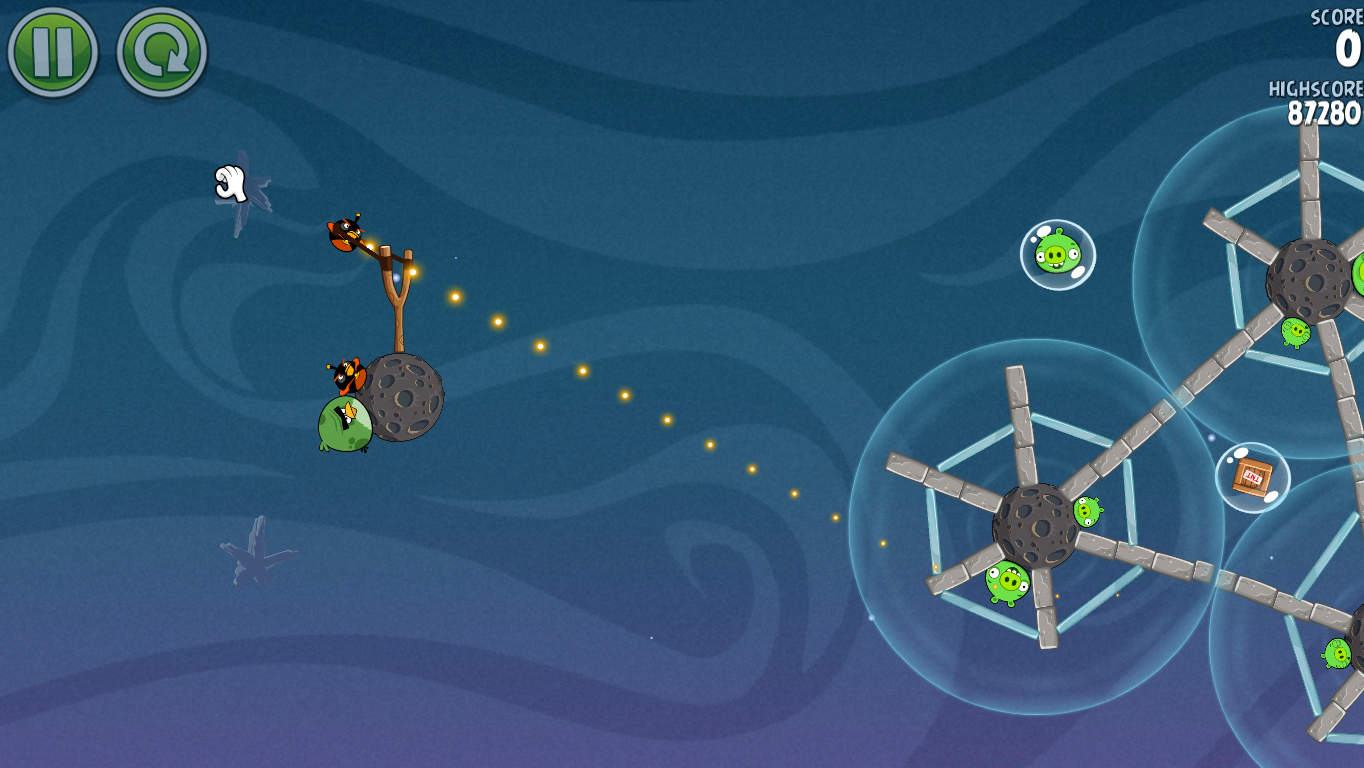Запустите банку с сардинами в нижний край орбиты так, чтобы она пролетела и оказалась между свиньями, находящимися в пузырях, которые держатся на «цепочке» из стеклянных блоков.