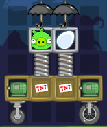 Создайте всего один свиномобиль, и три звезды будут вашими. Сначала закройте зонтики. Потом откройте нижний, чтобы устройство замедлилось до того, как перепрыгнет на левую часть холма. Сразу же, как транспорт начнёт переваливаться через край холма, откройте верхний зонтик, это позволит достать коробку со звездой.