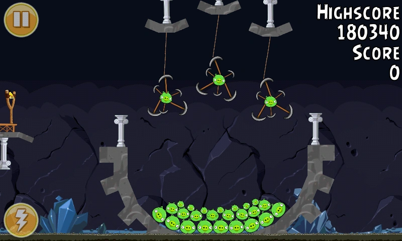 Постарайтесь Редом, Теренсом и Стеллой уничтожить всех свиней, а когда очередь дойдёт до Чака, запустите его в свинью, свисающую сверху. Именно в свинью, а не в цепь. После этого с неба упадёт множество стогов сена и самоуничтожающихся при контакте с чем-либо свиней, которые доломают оставшиеся блоки на уровне.
