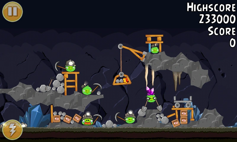 Запустите жёлтую птицу в леску. Дальше свиньи с кирками будут уничтожать других свиней. Когда остаентся 1-2 свиньи, появятся динамиты и камни, которые окончательно уничтожат свиней.