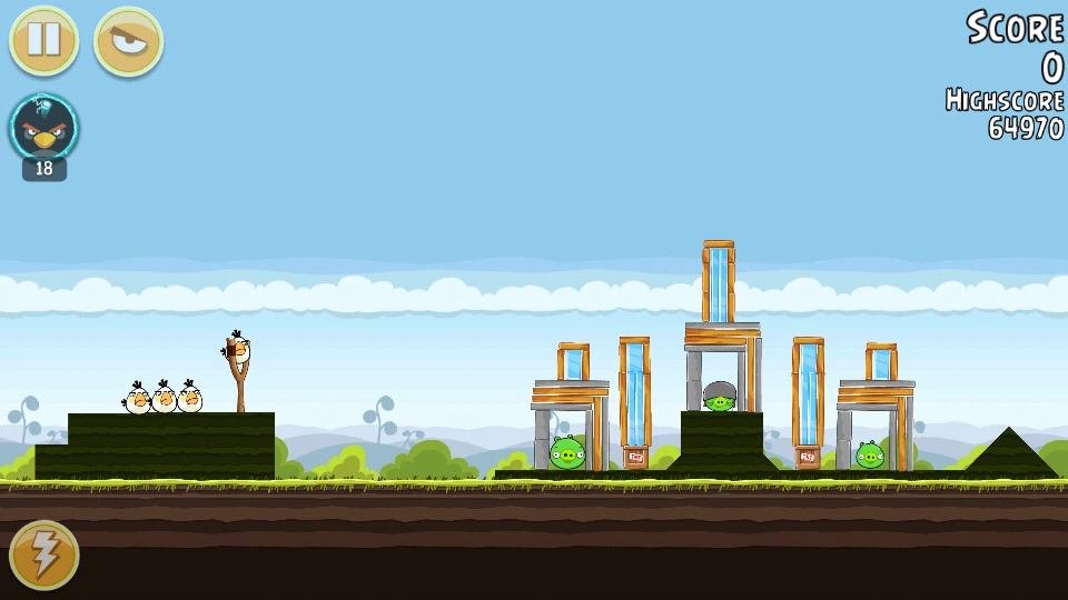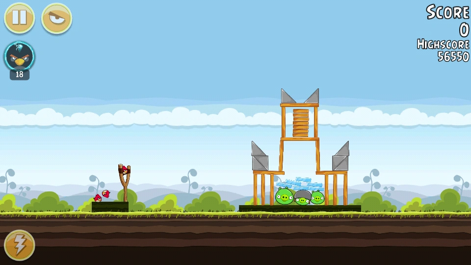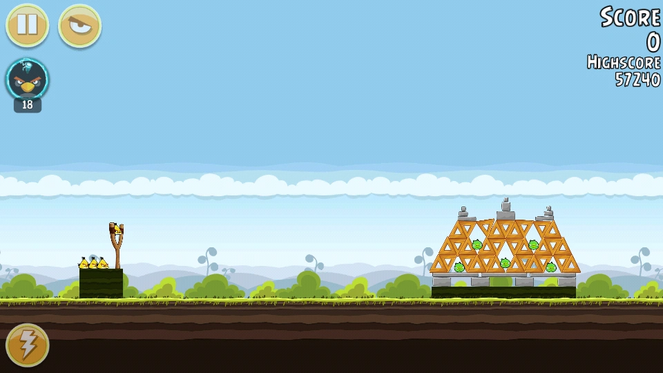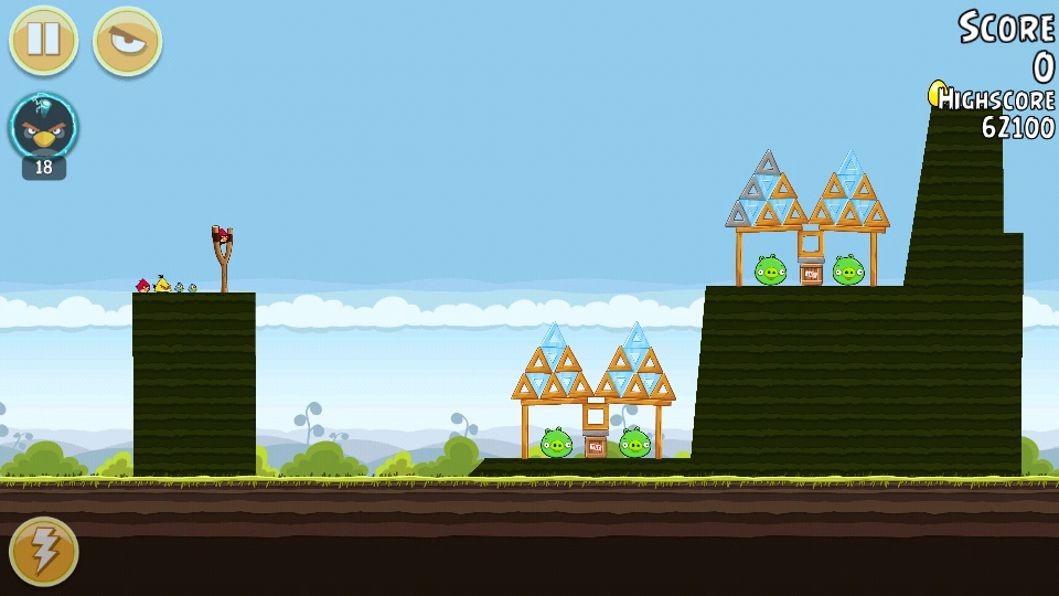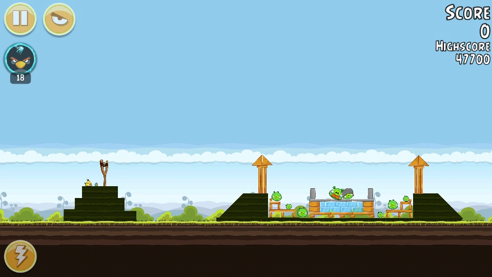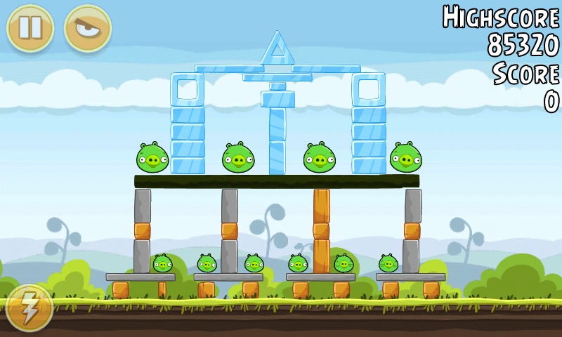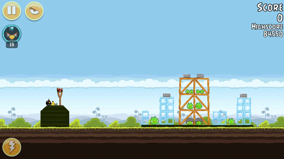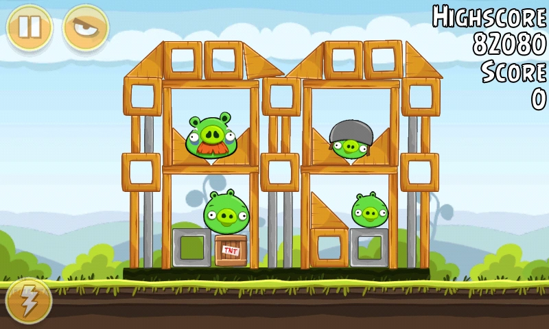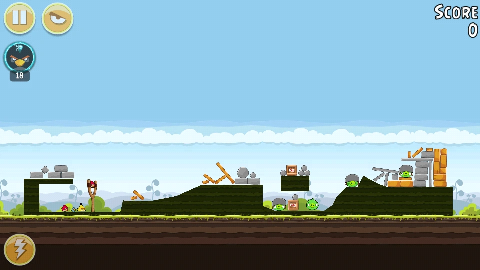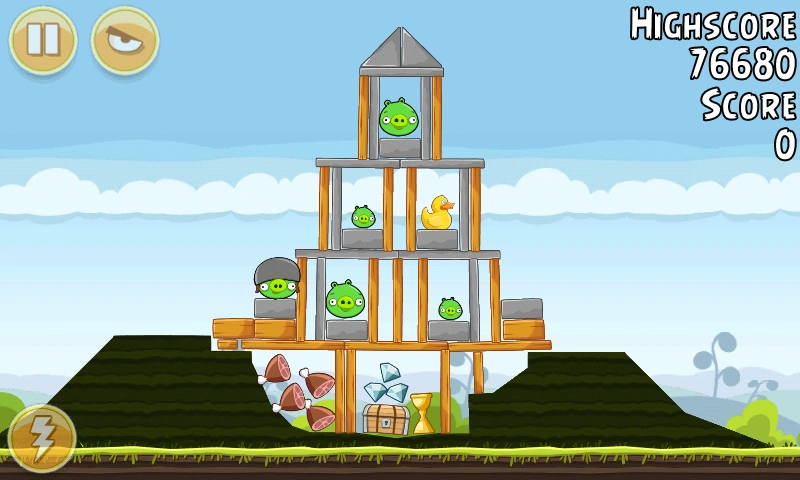 С помощью Чаков уничтожьте свиней вдали (все деревянные блоки там тоже). Орла бросьте под мешающую башню. Всё будет уничтожено. Первая локация пройдена.