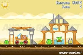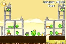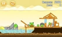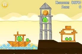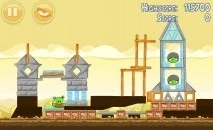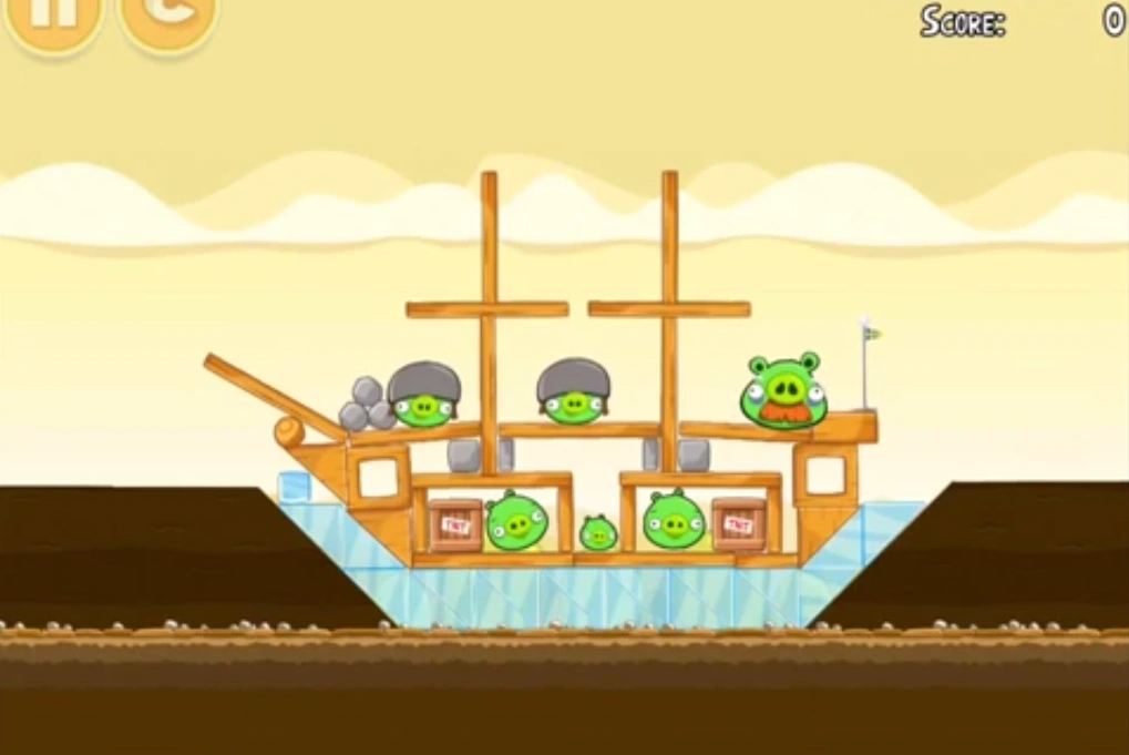 Уровень несложный. Если хотите, вы можете попытаться сбить каменную башню, а потом запустить орла в левое строение. Если нет- сразу запускайте банку в щель между башней и «лодкой» свиней.