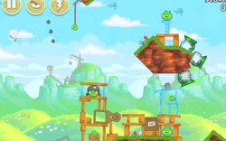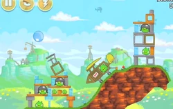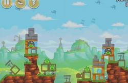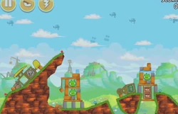 Сначала запустите Синих птиц в дальнее строение. Всё должно, кроме свиньи в машине, должно быть разрушено. Чтобы разрушить её, запустите банку с сардинами в машину со свиньёй. После этого почти все блоки будут разрушены.