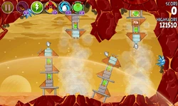 Запустите банку с сардинами в цетр строения, которое соединяет две планеты, останутся две или три свиньи. Их добейте следующей птицей. Уровень пройден!
