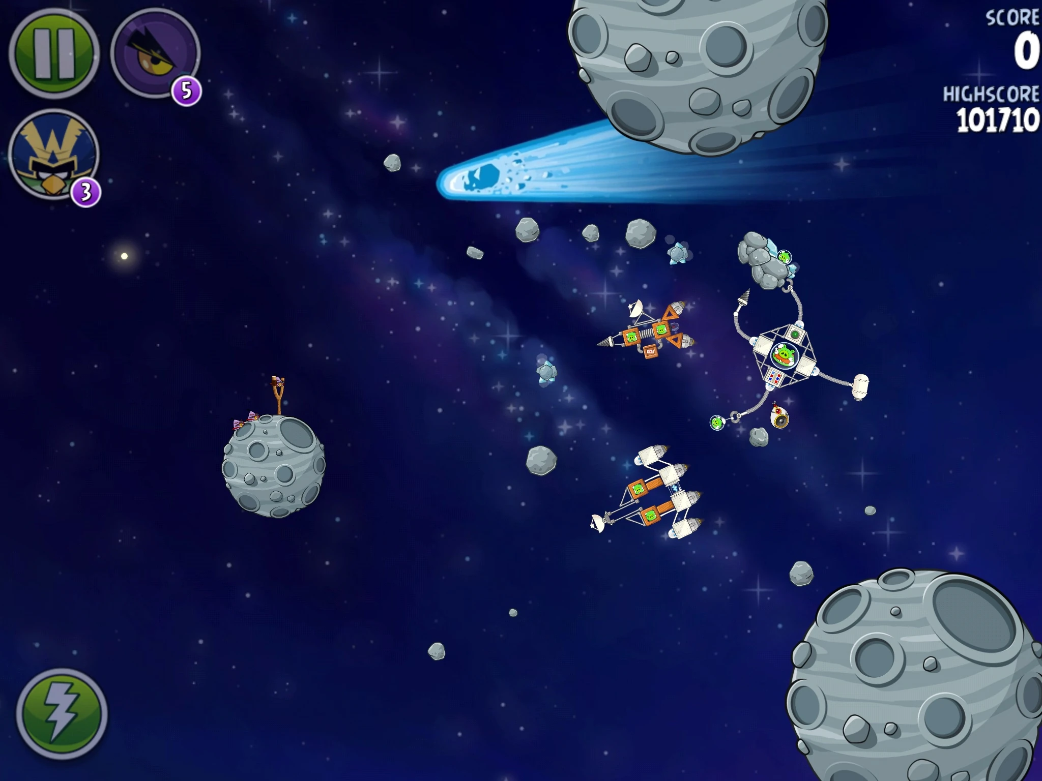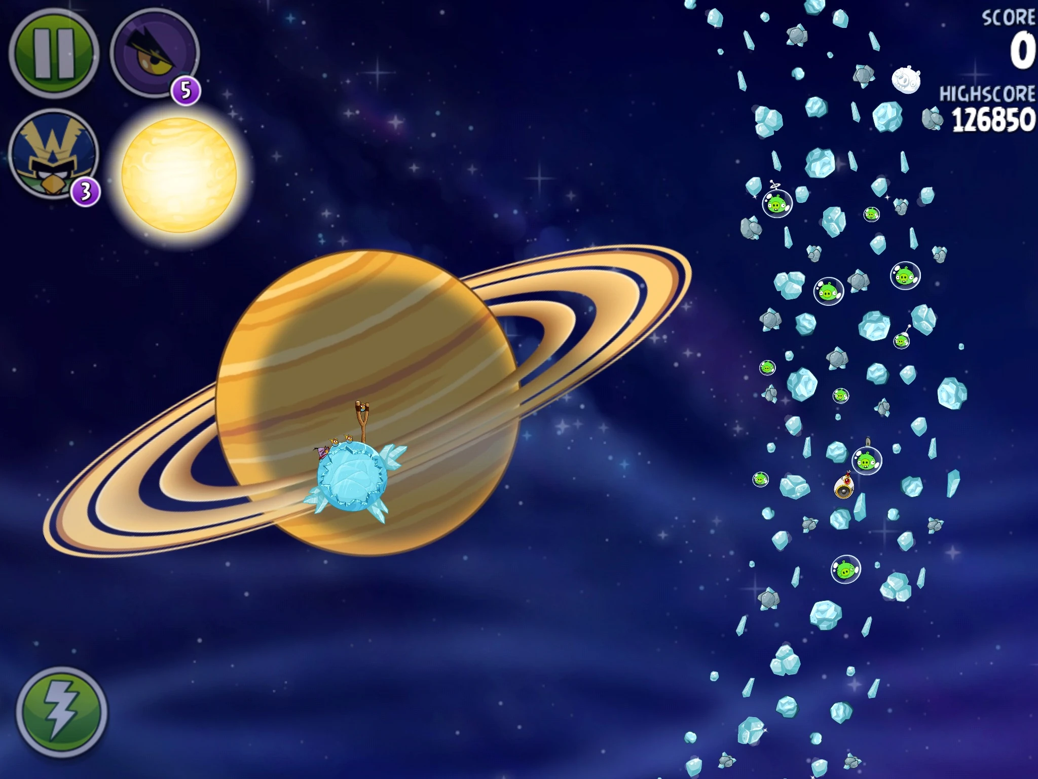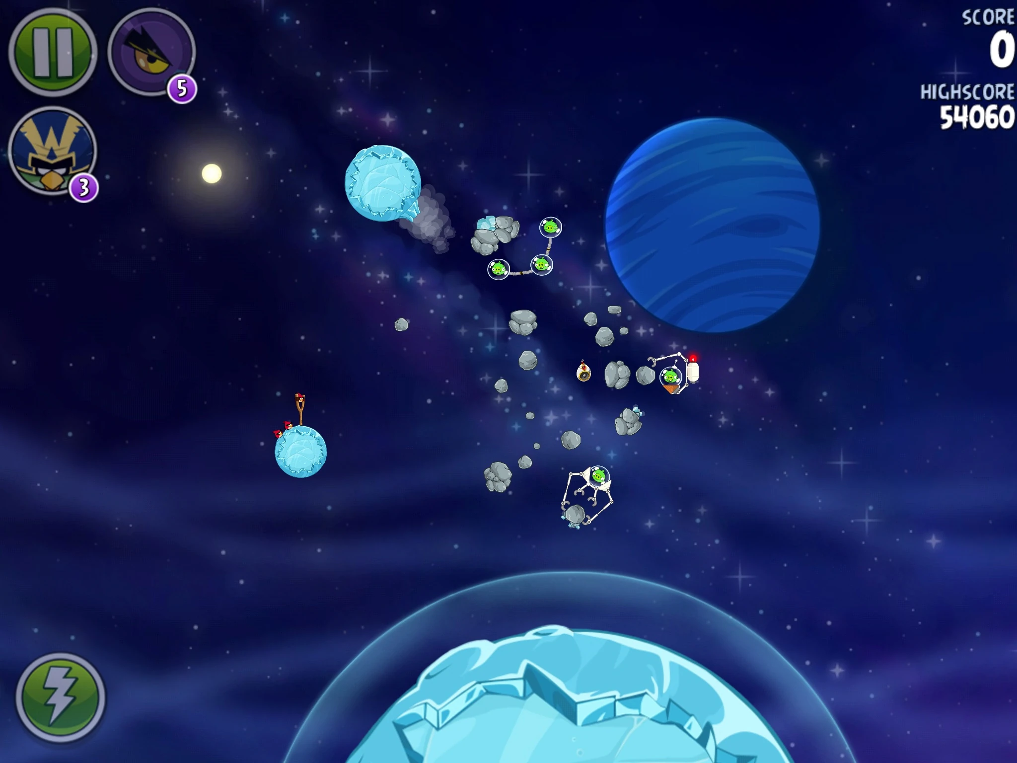 Для прохождения этого уровня потребуется помощь одной птицы. Попадите Чаком в верхний газовый баллон, попутно лопнув свина-миньона в пузыре. В итоге эта постройка с двумя свиньями-миньонами закрутится и толкнёт астероид, который в свою очередь толкнёт И.С.К.Р.У, и от её взрыва маленькие астероиды разлетятся и убьют почти всех свиней, останутся только две. Их добейте Космическим орлом.