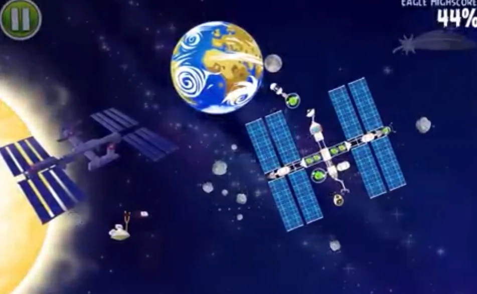 Чтобы пройти этот уровень, потребуется помощь одной птицы. Попадите первым Космическим орлом в космическую станцию с взрывным баллоном. Затем Чаком цельтесь в газовый баллон рядом с постройкой, в которой находится Усач, в результате чего все свиньи будут повержены.