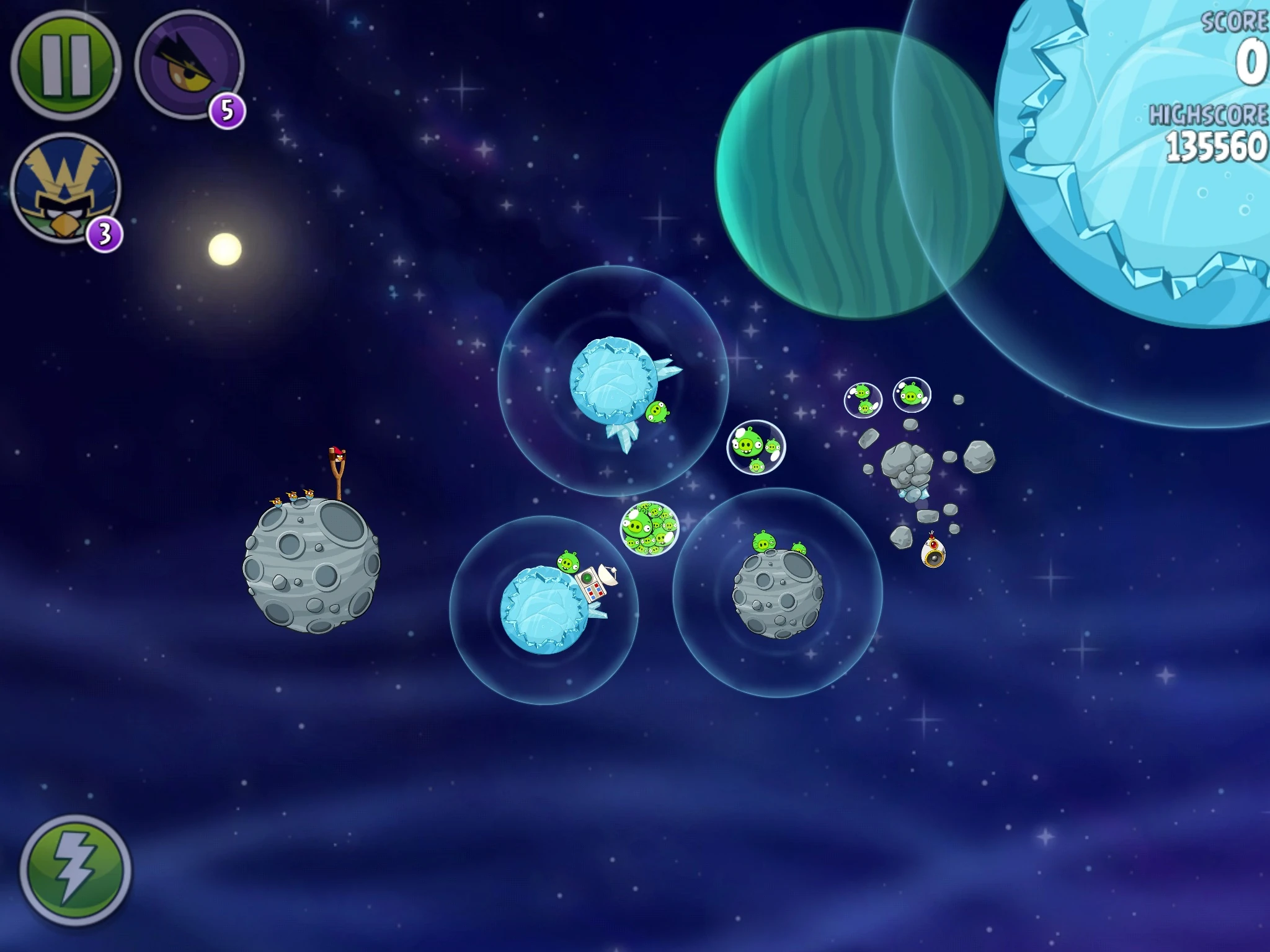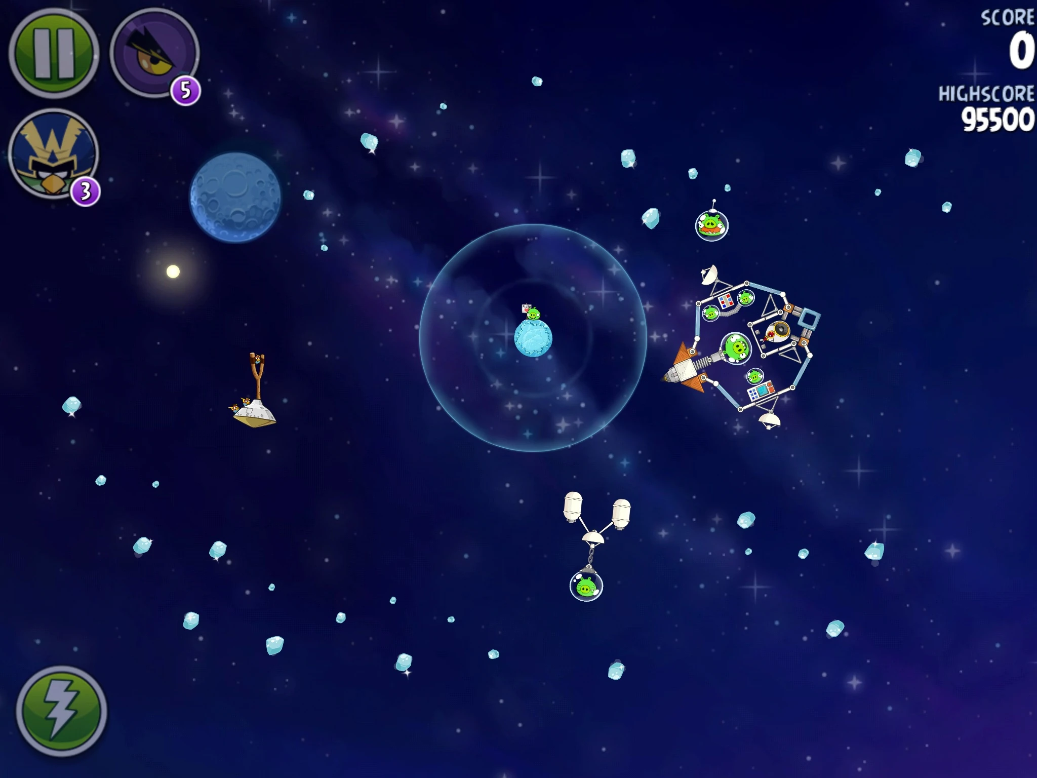 Чтобы пройти этот уровень, вновь потребуется помощь одной птицы. Киньте банку с сардинами в космическую станцию, из-за чего свиньи умрут из-за взрыва. Далее Синей троицей цельтесь в правый баллон с газом, где сидит свин-миньон, вследствие чего баллон вместе с ним полетит и добьёт как его, так и другого свина-миньона, сидящего на маленькой ледяной планете.