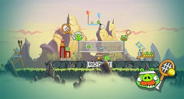 Киньте Теренса в Эля Свинадора. Отскакивая от стены, он уничтожит всех свиней в правой части. Потом запустите Чака в облака так, чтобы вниз упали буквы «OMPi».