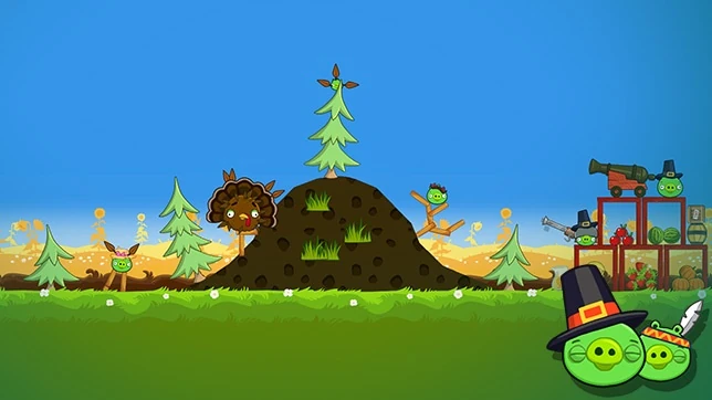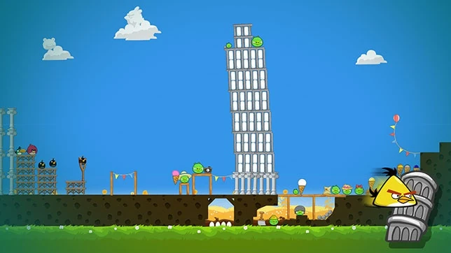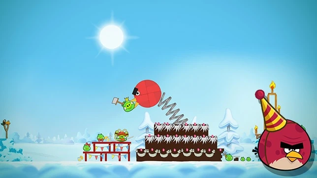 Оранжевую птицу запустите в ёлку на холме. Ёлка упадёт и убьёт свиней за ней. Бабблз покатится и должен уничтожить свинью рядом. Чака запустите в строение из красного дерева. Уровень пройден.