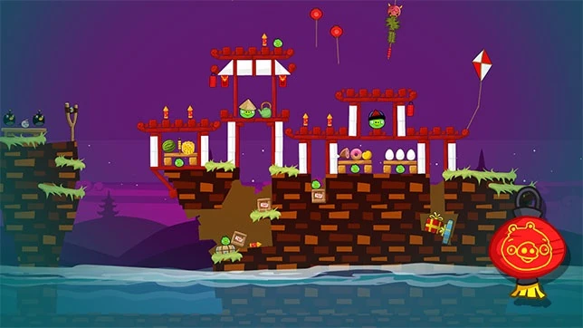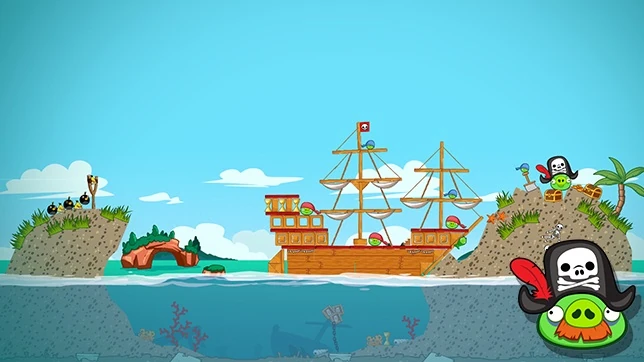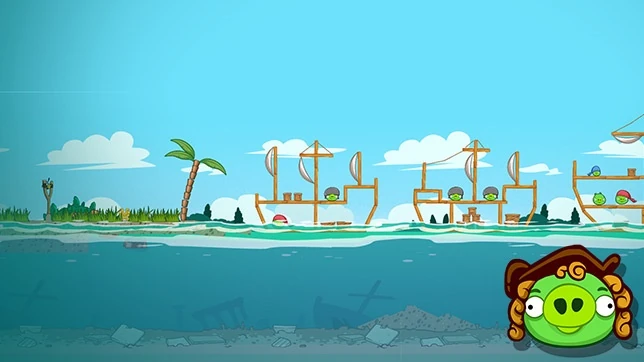 Сначала Чаком сбейте маленькую хрюшку, находящуюся перед Королём свиней. Далее кидайте Бомба в воду, он должен попасть по днищу корабля, предварительно перерубив цепь с динамитами. Далее просто добивайте оставшихся свиней остальными птицами, но старайтесь уничтожать побольше блоков.
