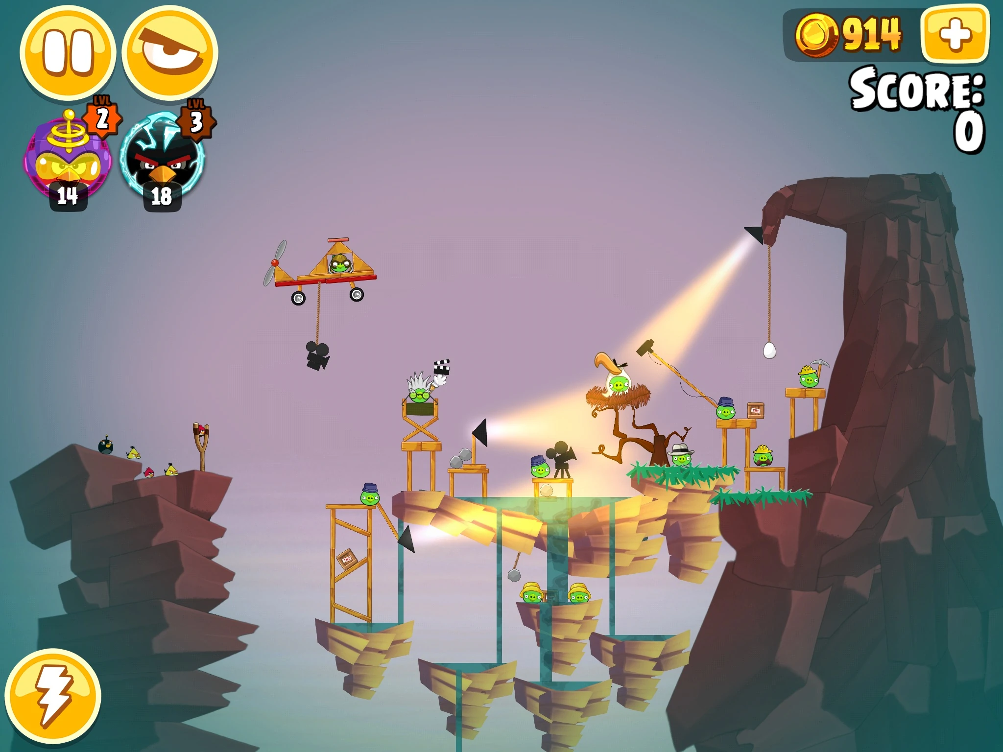 Красную птицу запустите в ближайшую свинью, висящую на шарике. Стеллу запустите в нитку, которая соединяет вторую свинью с шариком. Она упадет на вершину большой постройки и поднимет её часть в воздух. Если еще останутся свиньи, то уничтожьте их Бабблзом.