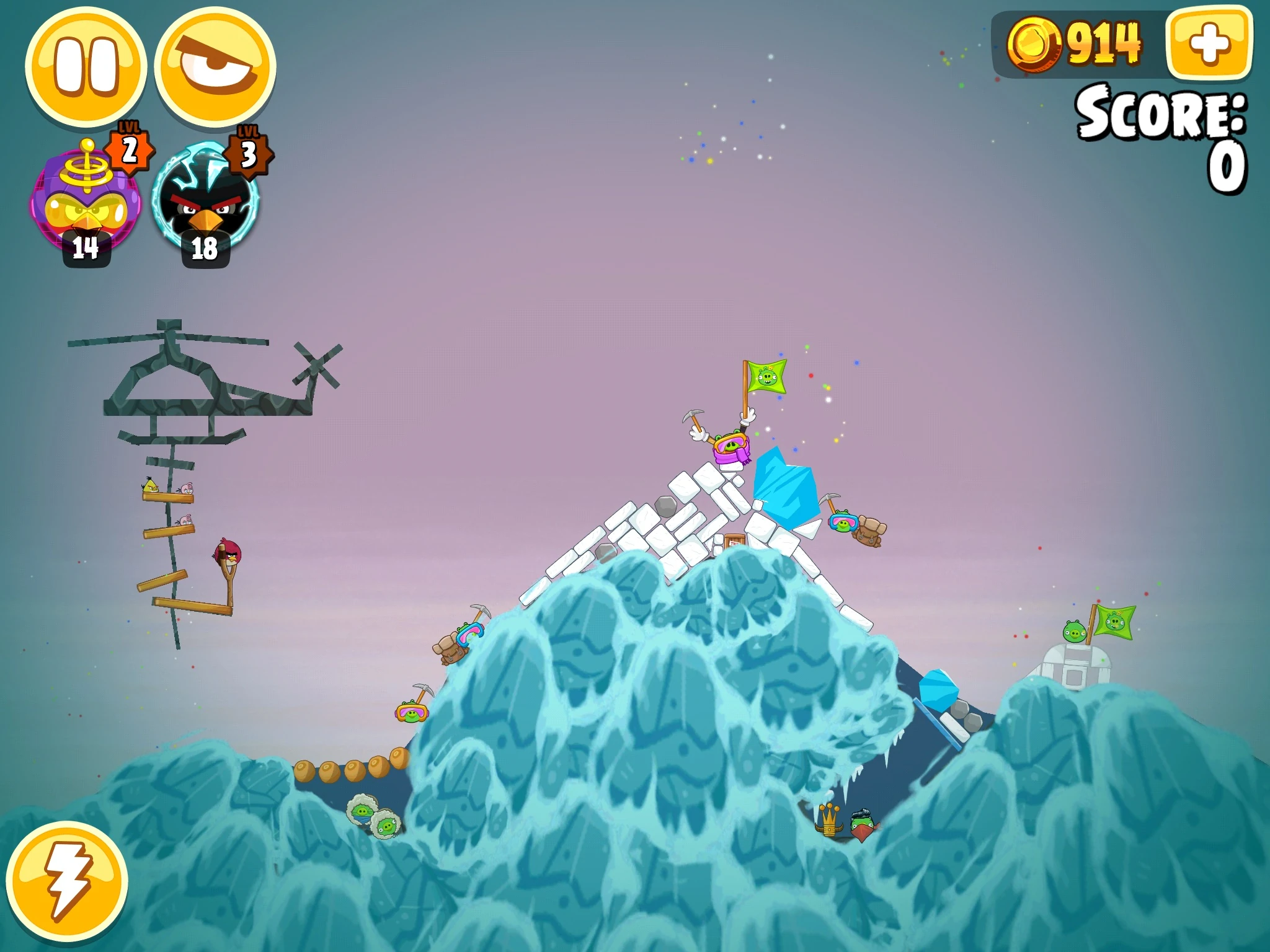 Первую розовую птицу пульните в ближние ледяные глыбы и активируйте способность. Большая глыба должна покатиться и убить нижних свиней. Следующую розовую птицу кидаем в ту самую же глыбу и с помощью способности пытаемся убить свинью на иглу. Третью такую же птицу кидаем в ближний круглый камень в снежных блоках, активируем способность. Все свиньи убиты.