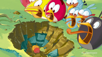 Птицы беззаботно отдыхали на поляне, как вдруг открылся портал, из которого вылетело существо с небольшим круглым метеоритом. Оно сильно ударило в землю, создав кратер. Ред первым решился подойти к месту происшествия. Пришельцем оказалась ледяная птица с яйцестероидом. Придя в себя после касания клювом Реда, она хватает яйцестероид и выпрыгивает из кратера и готова обороняться. Тут из портала появилась механическая рука, схватившая кусок земли, на котором находилось космическое яйцо. Разозленная ледяная птица бросилась в портал из рогатки. После того с неба плавно опустились три надетые ранее на яйца стаи кепочки. Поняв, что их яйца также похитили, все птицы приходят в ужас и сразу бросаются в погоню. Пролетая через портал, они мутируют, получая суперспособности и теперь полностью для борьбы за потомство...