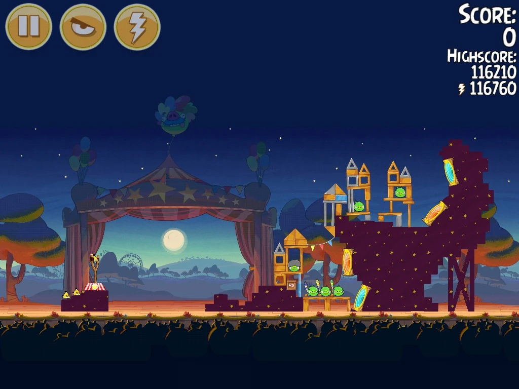 Shoot Chuck in a high arch and go through the banners into the bottom blue portal. Shoot the next bird into the bottom red portal to finish off the remaining pigs.