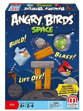 Angry Birds: Birds in Space is the 1st Angry Birds Space board game made by Mattel. It includes 2 Space Birds, a Space Pig Helmet and a Breakable Asteroid.