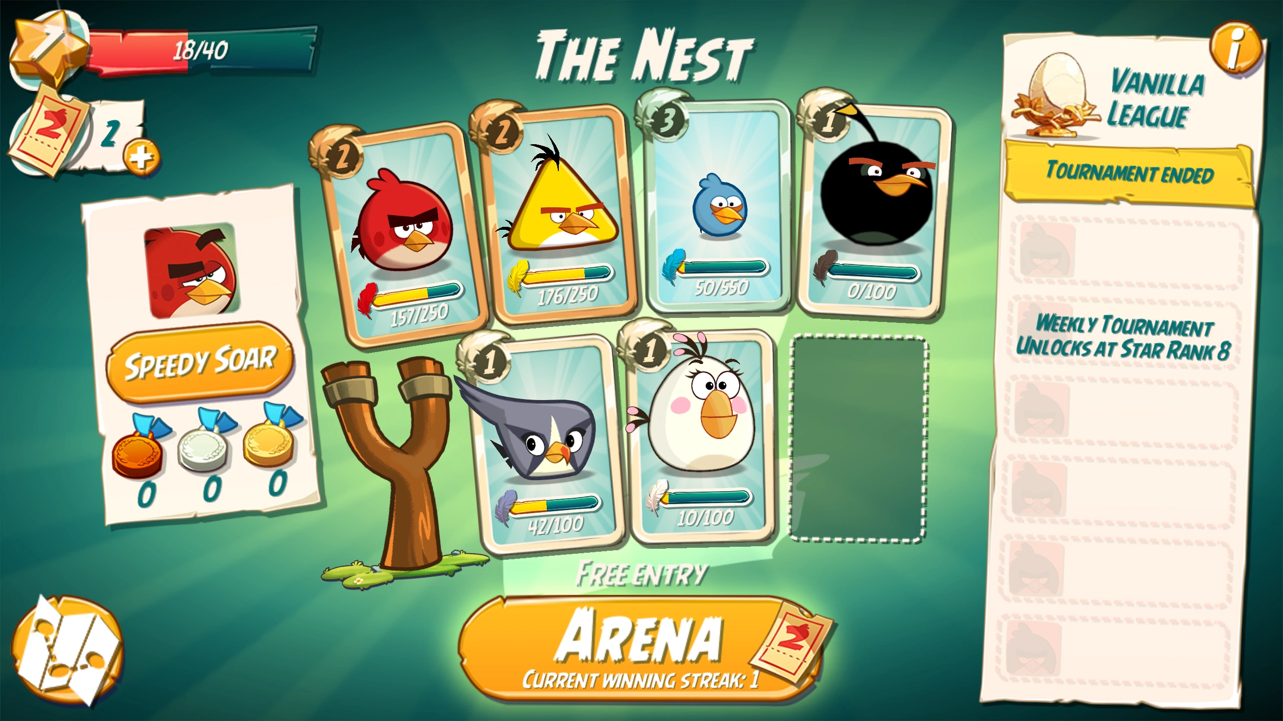 Players will enter against CPU players in arena once they reach at least a star rank of 8. During the battle, five birds including extra birds will be played at random daily. Once fulfilled, they will start in the vanilla league and progress at the end of every week. Placing in the top 3 (