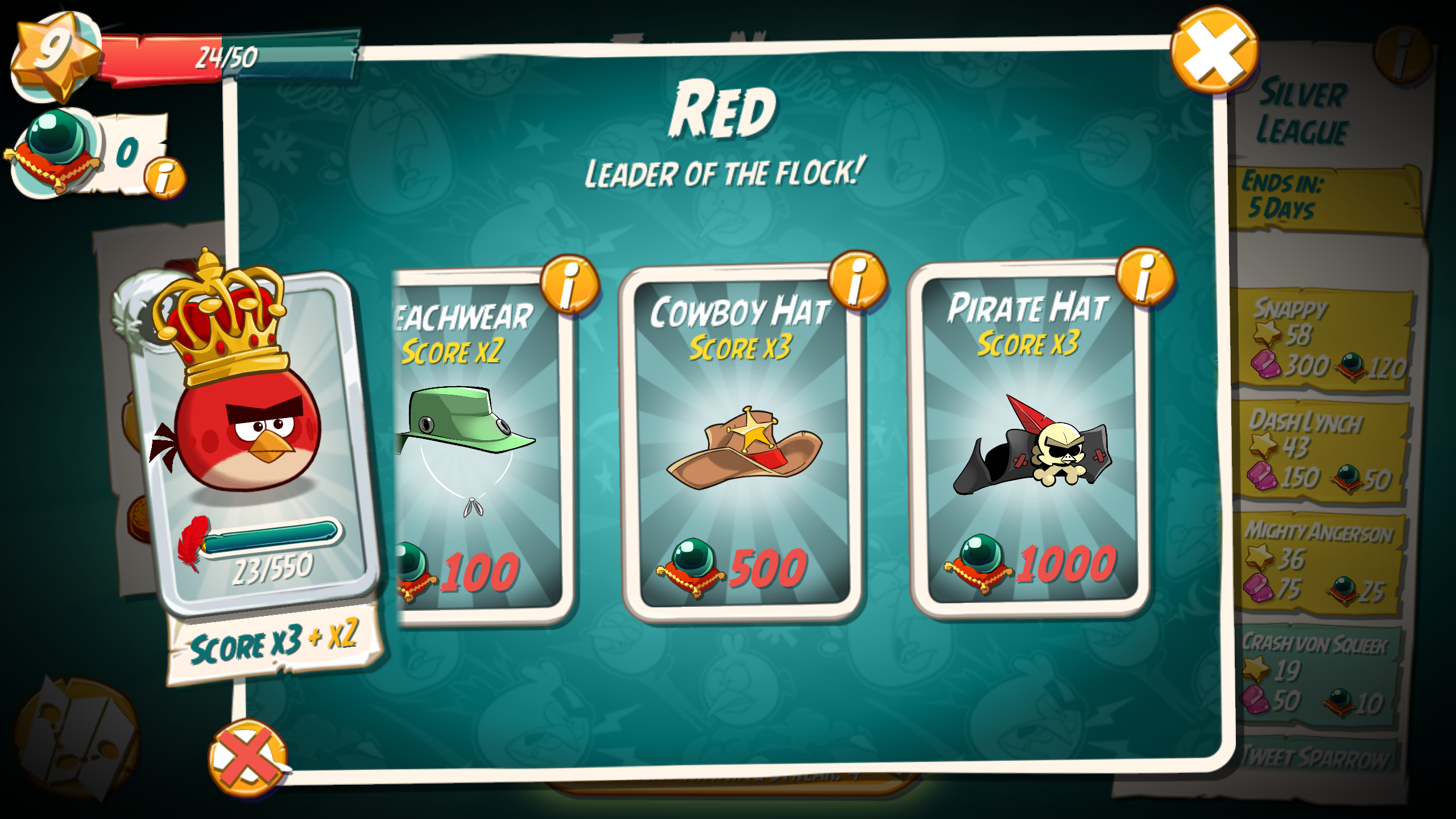 - Example: If Red has a score x5, the slingshot has a score multiplier x4, and the Bird Hat has a multiplier of x3, then Red's Power or score multiplier be x12.