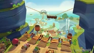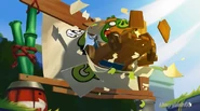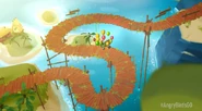Then, King Pig flips the dial so balloons come out of his kart as he floats by and takes the first place advantage away from Chuck meaning that the Mega-Rocket is not fast at all, but Chuck growls and forms purple boost to get the first place advantage back, but as Chuck gets the first place advantage back, all the parts of the Mega-Rocket have been broken, leaving only his seat as his kart while he knows that he is going to make it. The finish line flashes before the racers as they leap off the ramp, leading to the ANGRY BIRDS GO! logo.