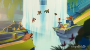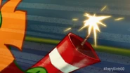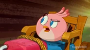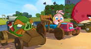 Then, they go up the ramp and back down the ramp, as King Pig calls Foreman Pig. Foreman Pig is shown calling King Pig with a telephone and laughs evilly. Foreman Pig is also shown with his TNT rocket on his hand, and Stella and Chuck scream, as Chuck knocks Foreman Pig off the track before he can slow Stella and Chuck down, (he crashes through a sign and knocks a rock pile over) and King Pig gasps, but he makes a recovery as he goes around the log without needing suction cup wheels, and Stella now gets upset while King Pig teases.