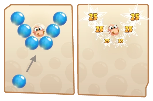 ) (Every successful pop will bring in one bee into the playing field up to 3 bees. Missing one will lose one, and changes color every 3 successful pops. Drop a bubble onto it, and it will bounce to score points. The color changes in order (