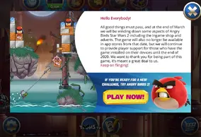 On February 3, 2020, along with Angry Birds Rio, and Angry Birds Star Wars, it was announced that the servers for Angry Birds Star Wars II were closed down due to licensing issues. However, the game can still be played as normal, but the player will not be able to make in-app purchases, or receive advertisements. Despite this, the Carbonite Reward and the Rovio Account features which both require an internet connection still work as normal. The Rovio Accounts however closed on March 18, 2022.