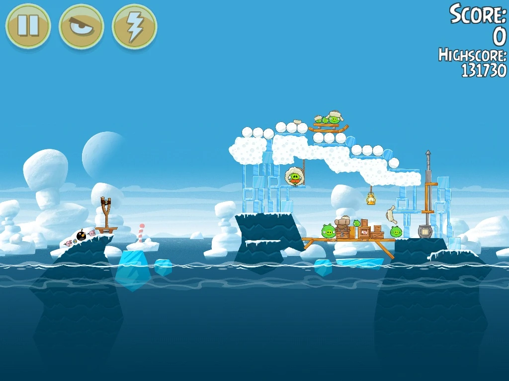Launch The Blues towards the snow blocks at the left to drop the snowballs, then shoot the next 2 birds at similar angles to finish the level.